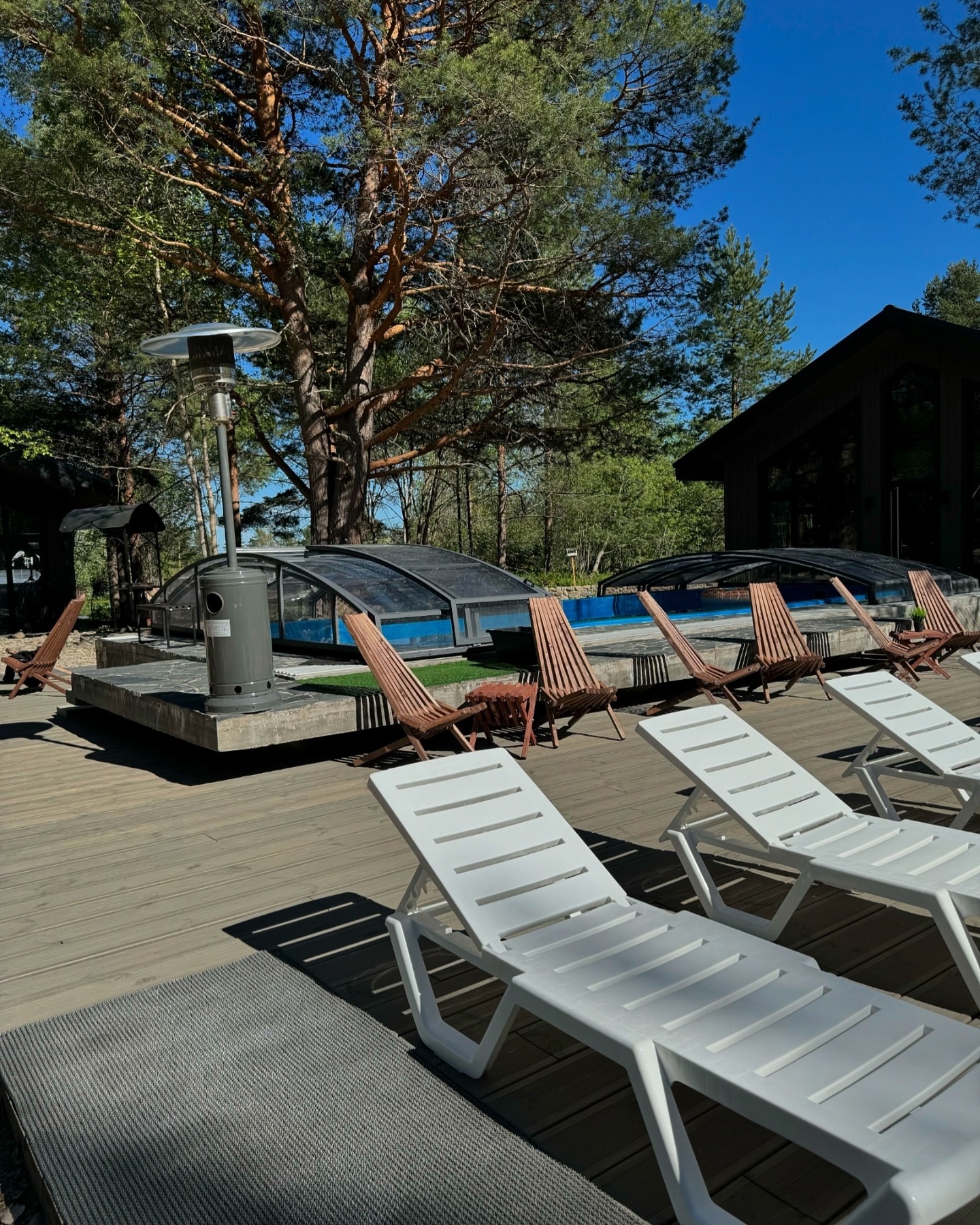 Комплекс окружён вековыми сосновыми лесами, холмами и озёрами, создающими уникальную атмосферу уединения и спокойствия. Вид на благоустроенную территорию с террасами и декоративными растениями делает ваш отдых особенным.
