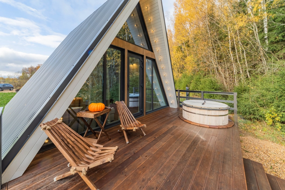 - А-фрейм с камином и купелью на террасе