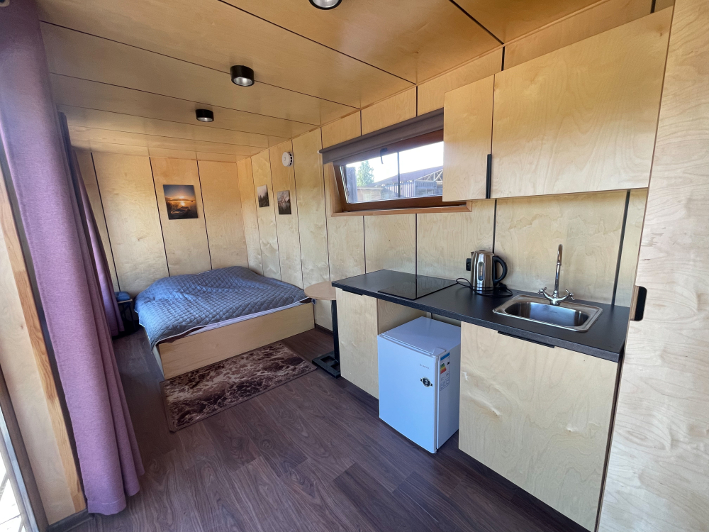 Гостевые домики: Двуспальная кровать, душ, кухня с посудой, терраса и мангал. Возможно дополнительное место.
