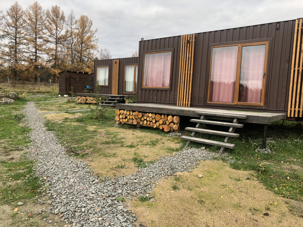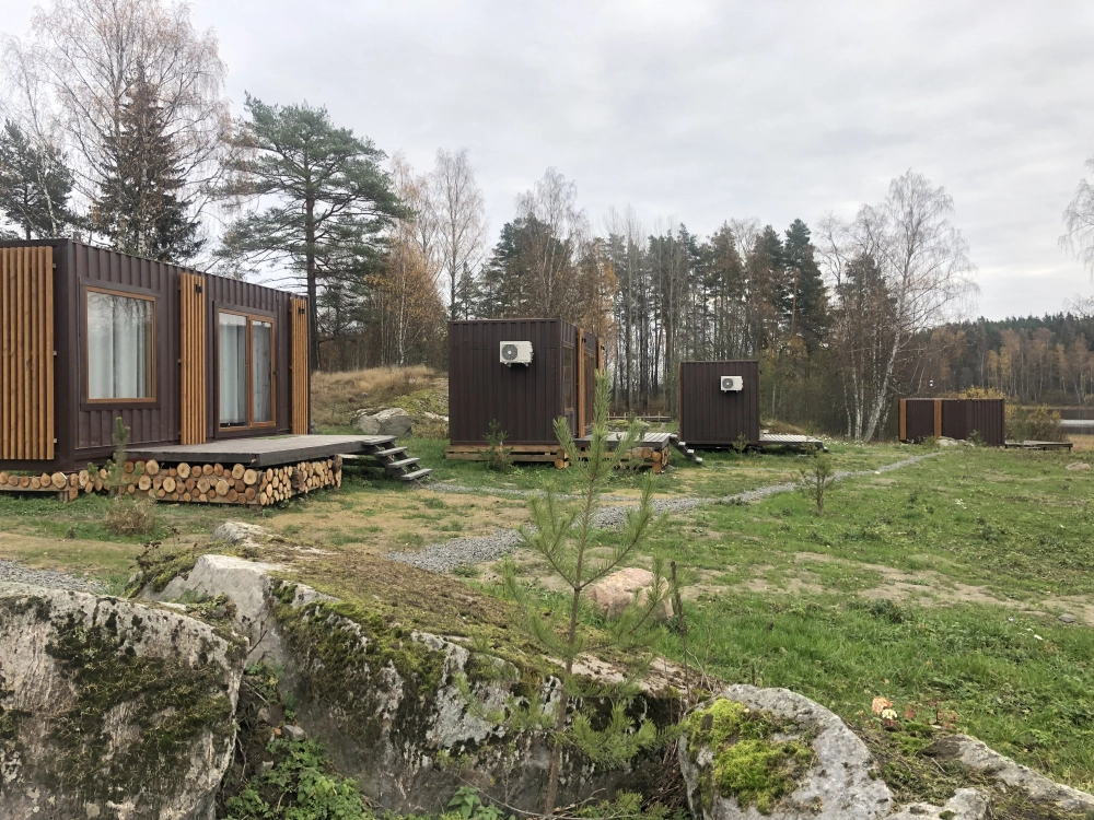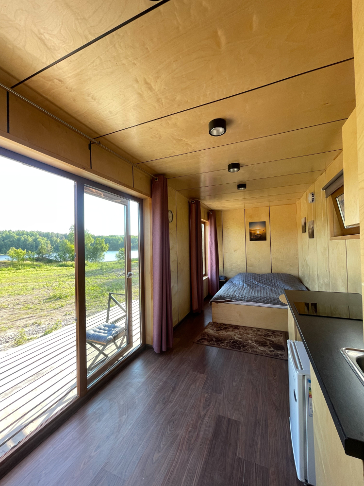 Домики для проживания с видом на лес и озеро, оснащённые всеми удобствами: кондиционер, кухня, душ, терраса, мангал.