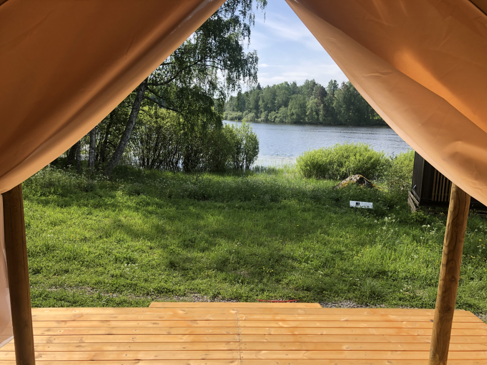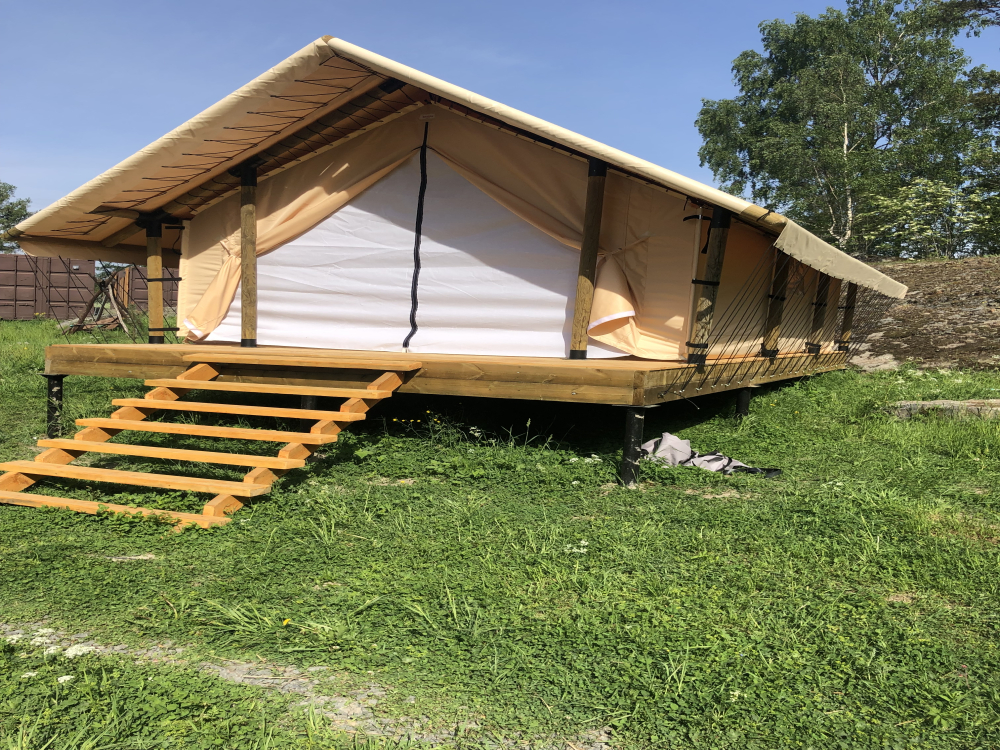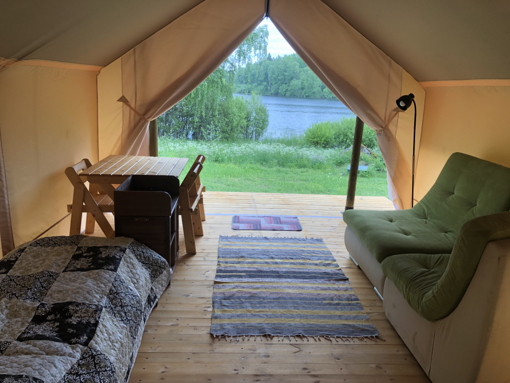 Шатры: Уютные шатры с одной двуспальной и одной односпальной кроватью, отопление дровяной печью, газовая плита, терраса с видом на лес.