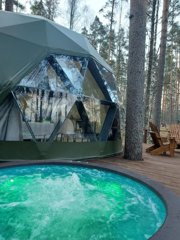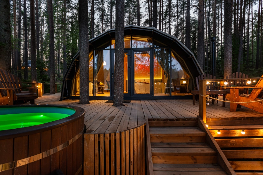 Сферы с купелями, зеркальные дома и уютные лоджи в сосновом лесу.