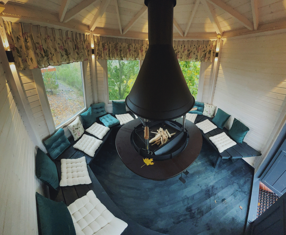 На территории имеется общая закрытая костровая зона, где гости могут провести уютный вечер у огня, наслаждаясь атмосферой тепла и уединения.