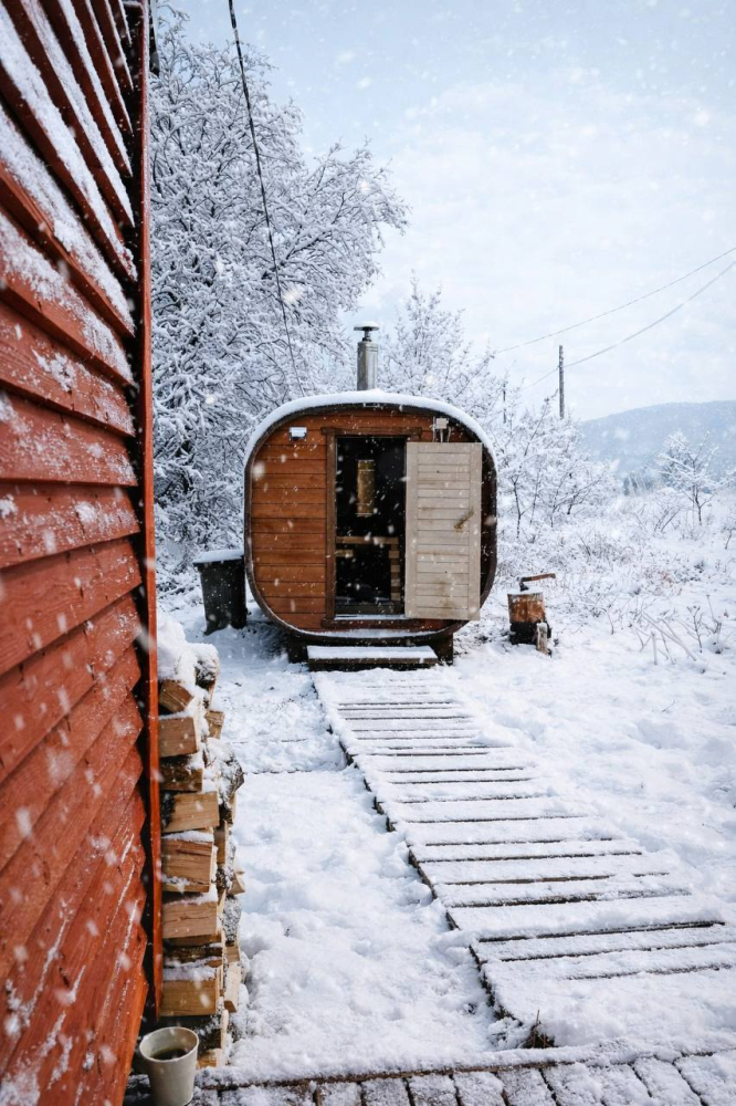 Баня есть около домиков Дом Аполло с баней на дровах и камином, Дом Буковски с баней на дровах и видом на озеро, Дом Фаталиста с баней и камином, Дом Анны с сауной в доме и камином.