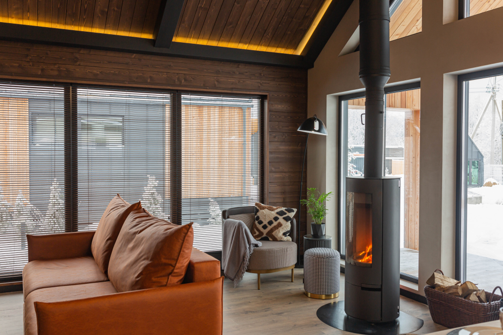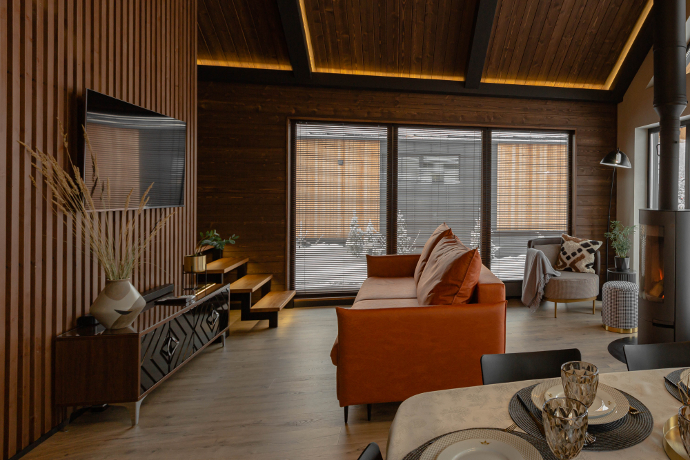Гостиная: уютный диван, кресло, торшер, большой телевизор с улучшенным Smart TV и печь-камин.