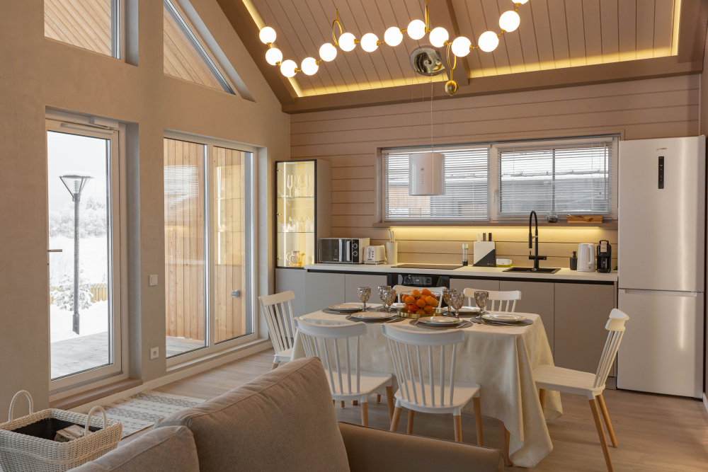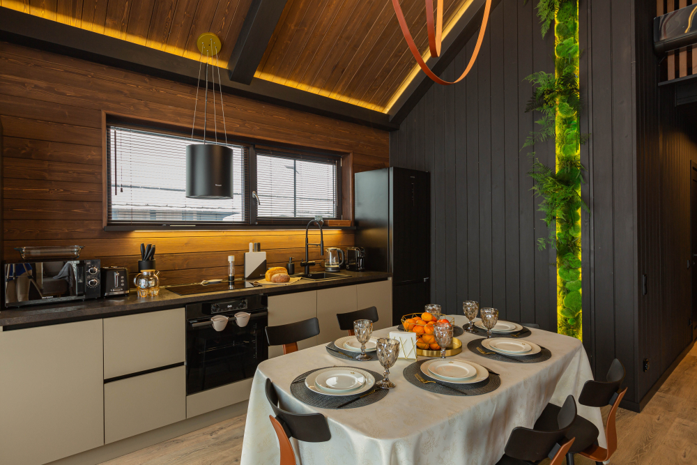 Кухня и обеденная зона: полный набор посуды и приборов на 6 человек, современная техника (кофемашина, духовой шкаф, СВЧ, посудомойка, холодильник, чайник и т.д.).