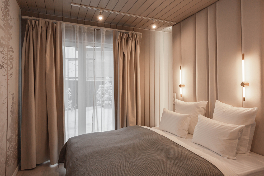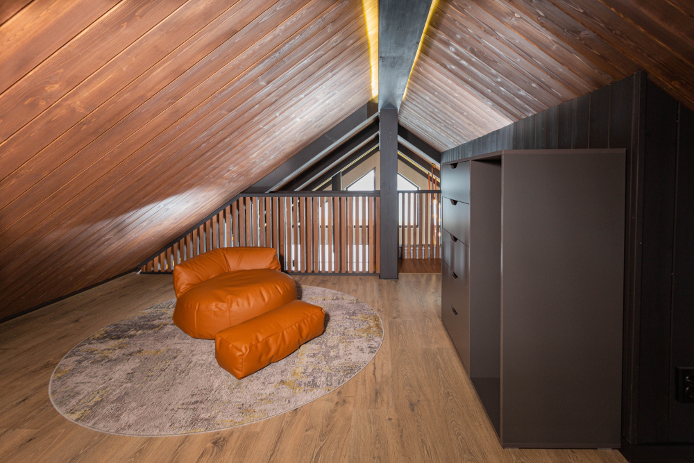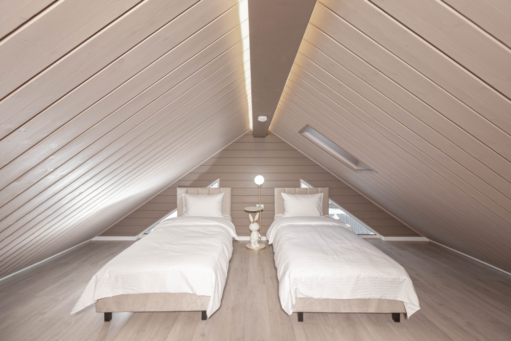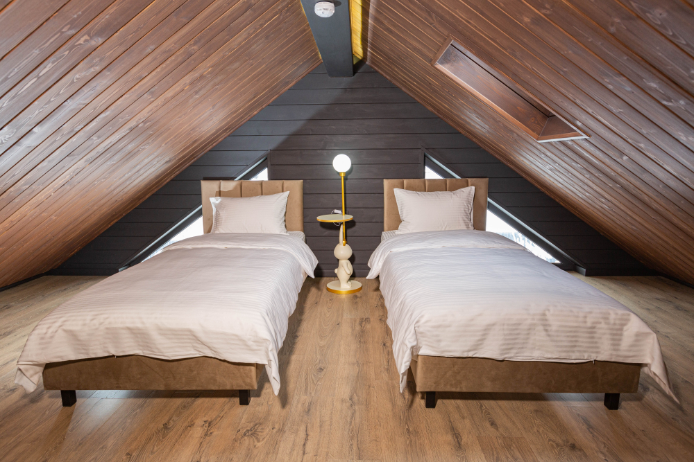 Спальные зоны: 2 спальни с двуспальными кроватями и мансарда с 2 односпальными. В каждой комнате — место для хранения вещей и розетка возле кровати.