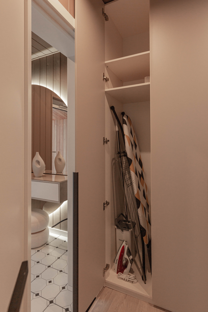 Бытовая техника: стиральная машина, фен, утюг с гладильной доской, полотенцесушитель, кондиционер и обогреватель.