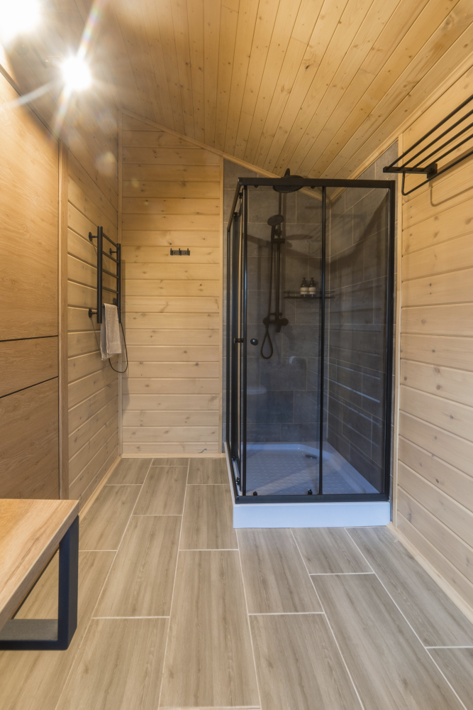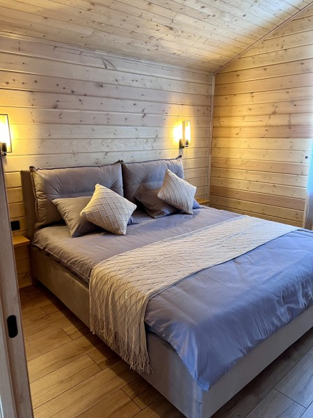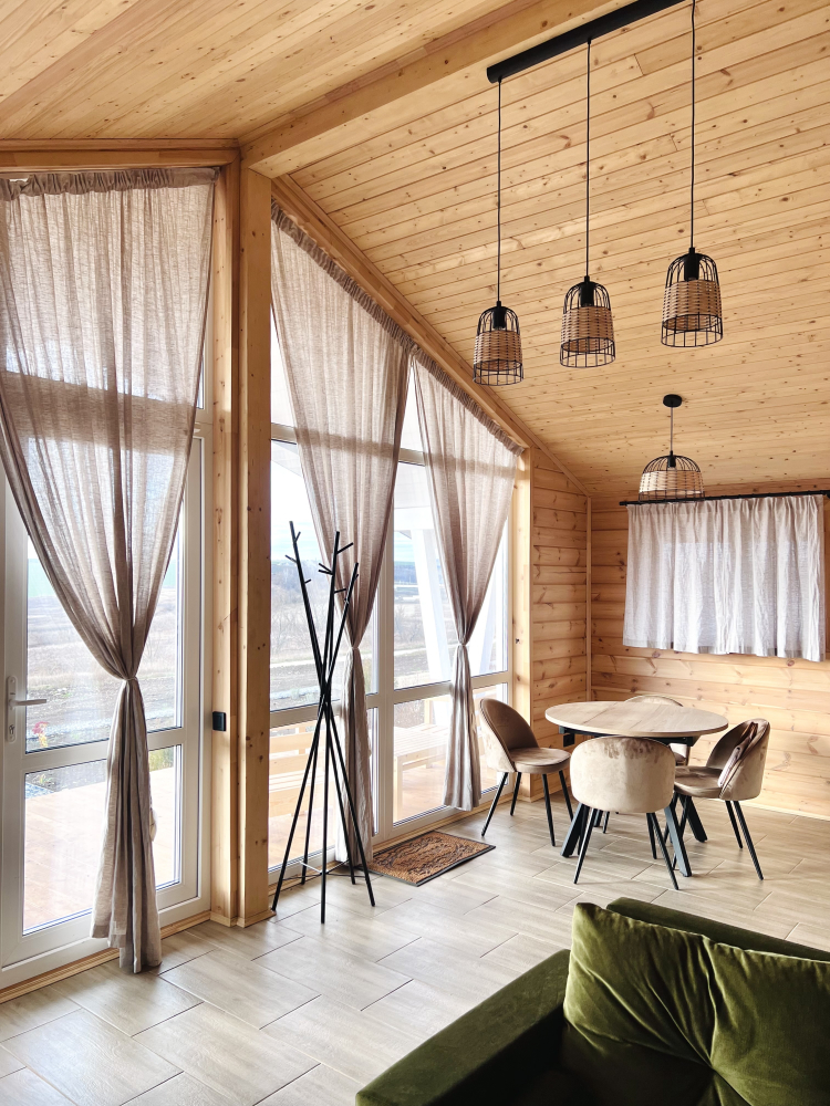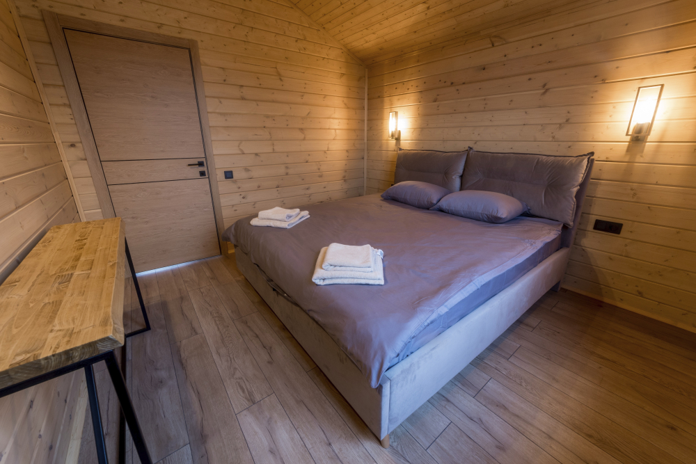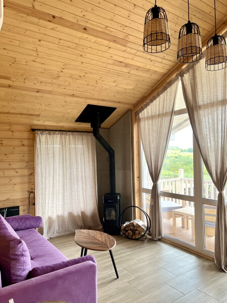 Лодж площадью 42 м² расположен в живописном месте с панорамным видом на окружающие просторы и цветущие поля. Интерьер выполнен в природных оттенках дерева и льна, с лёгкими цветочно-травяными акцентами, создающими уют.