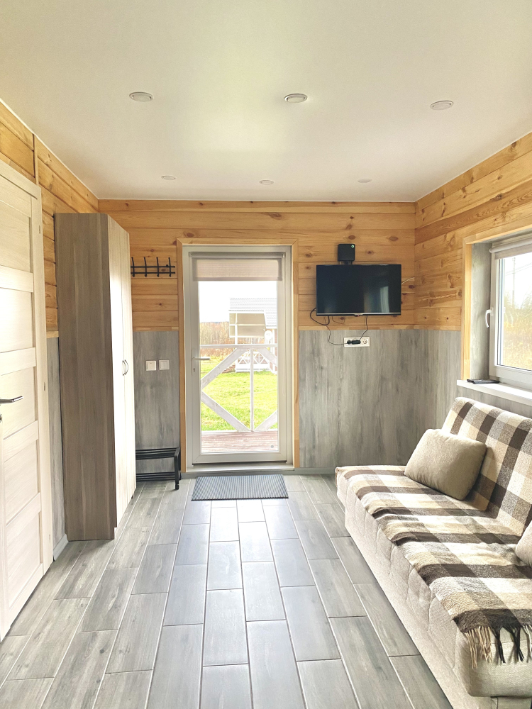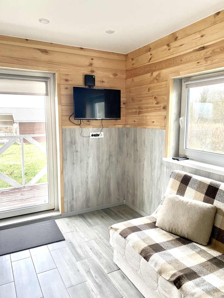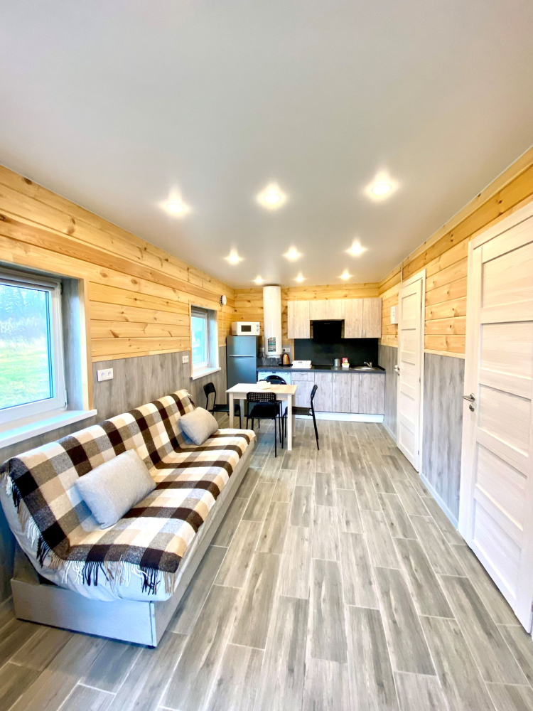 В коттедже одна отдельная спальня и кухня-гостиная с раскладным диваном.