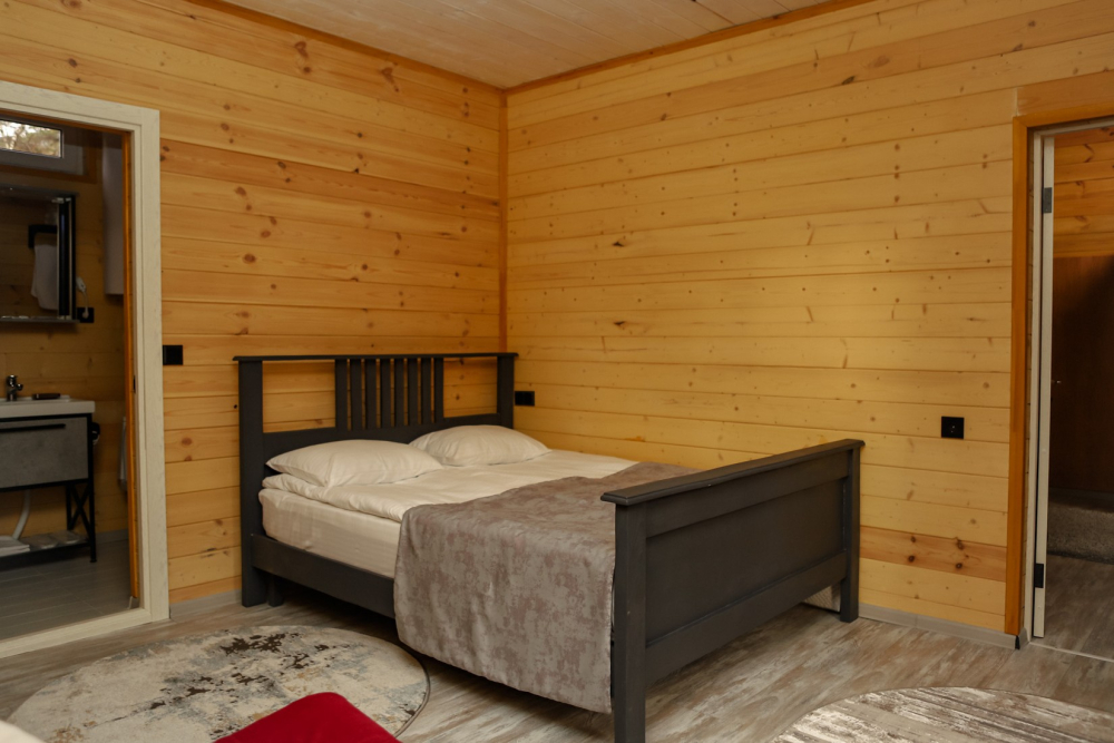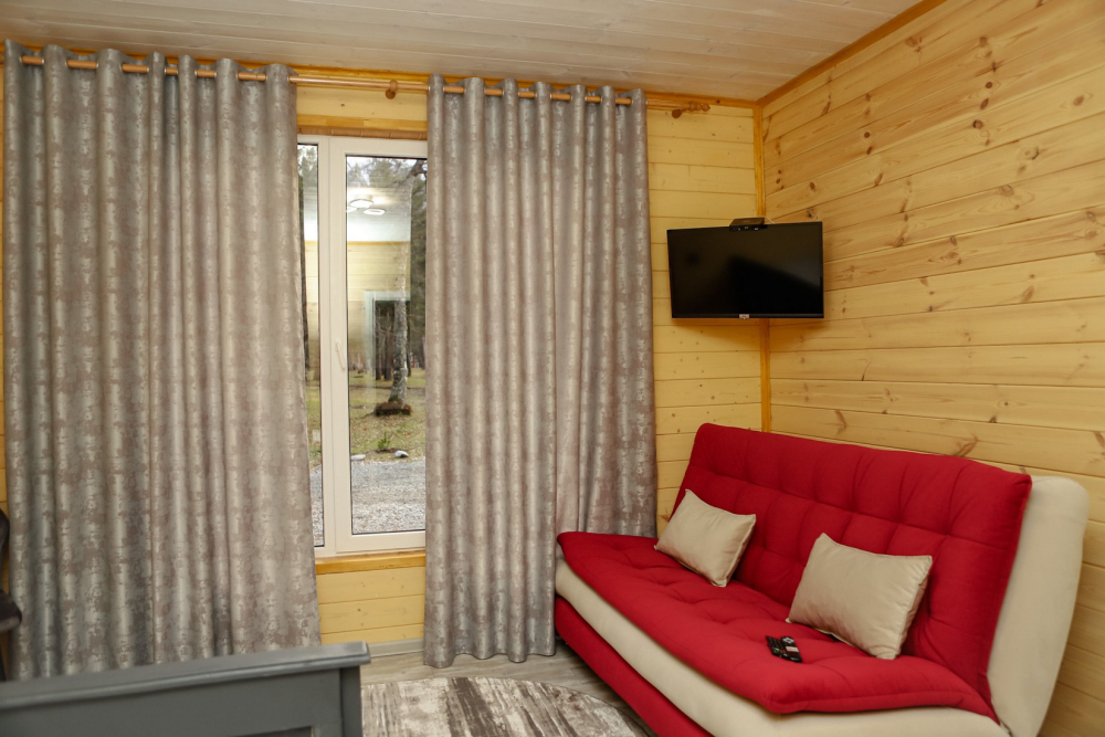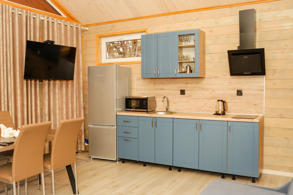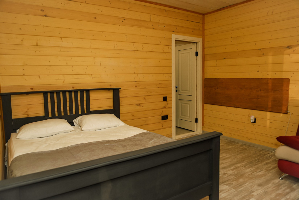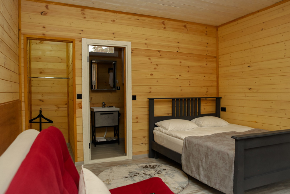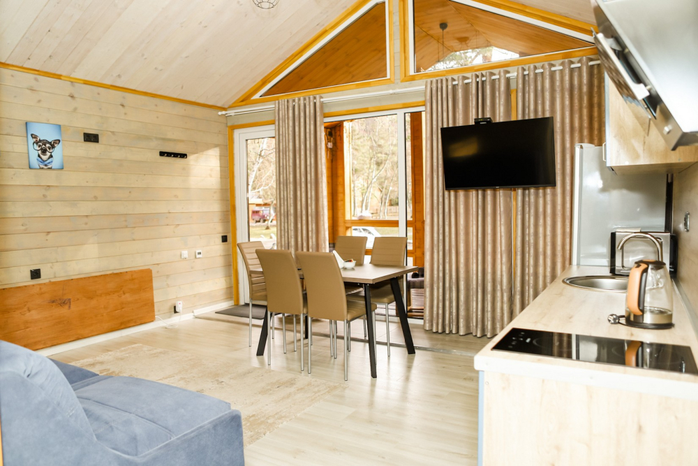Каждый домик оснащен всем необходимым для удобного отдыха: