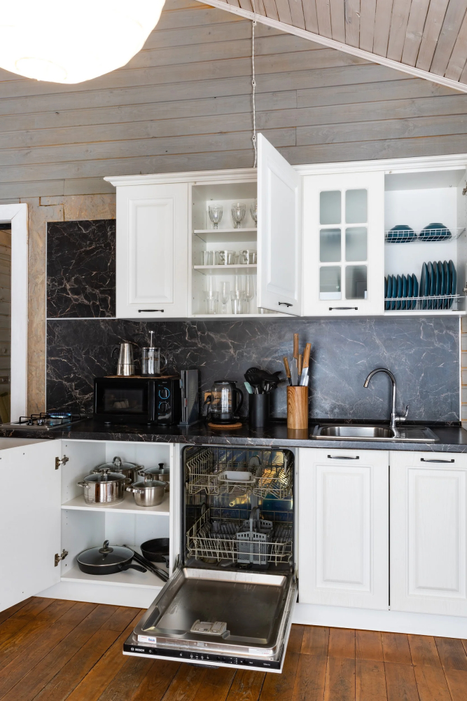 Кухонные удобства: Двухкамерный холодильник, посудомоечная машина, газовая плита, микроволновая печь, электрический чайник, кофемашина и полный комплект посуды для 6 персон.