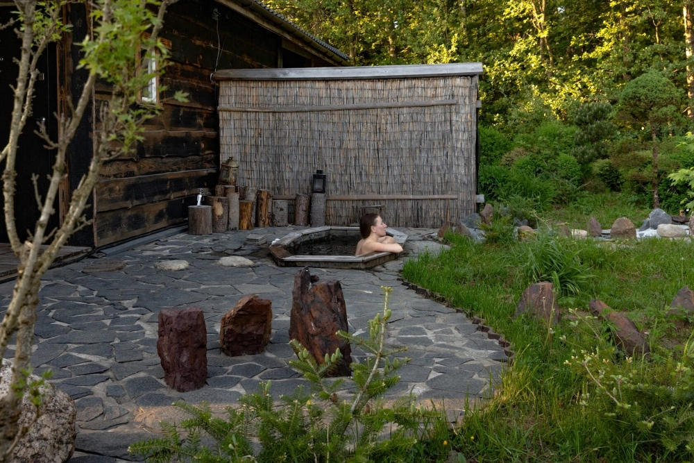 Японская баня «Сэнто» на 6–8 человек стоимостью 6 000 ₽ за 2 часа предлагает расслабляющий отдых с просторной гостиной, камином и кухней, оборудованной электрическим чайником, микроволновой печью и посудой. Гости могут воспользоваться крытой беседкой с мангалом для приготовления блюд на углях. Баня включает традиционную русскую парную на дровах с закрытой печью-каменкой и камнями из жадеита для лёгкого пара, обливное ведро для контрастного эффекта, уютные лавки под свесом крыши, защищающие от непогоды, и горячую японскую ванну «Ротенбуро» с видом на сад, выложенную карельским шунгитом. Из ванны можно любоваться природными пейзажами, наслаждаясь атмосферой сада «Любящих сердец».