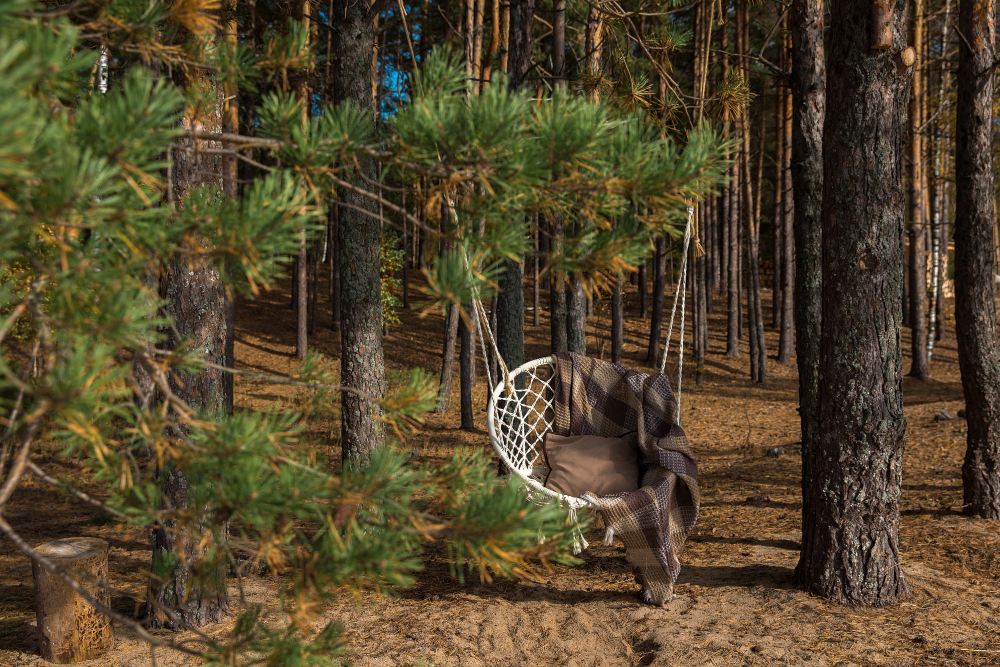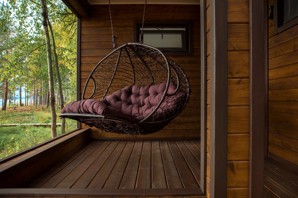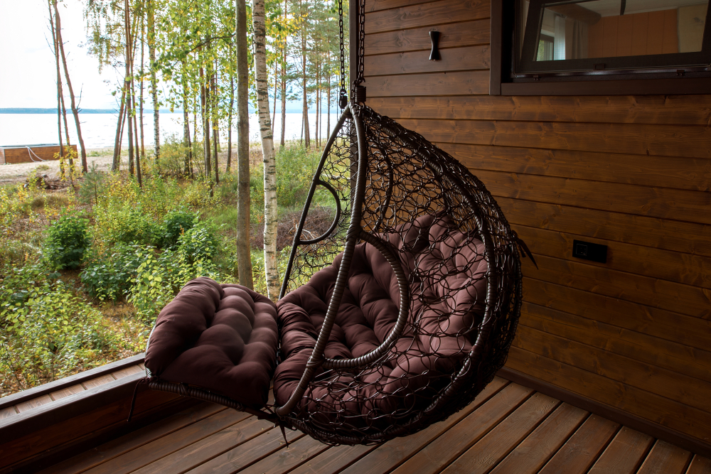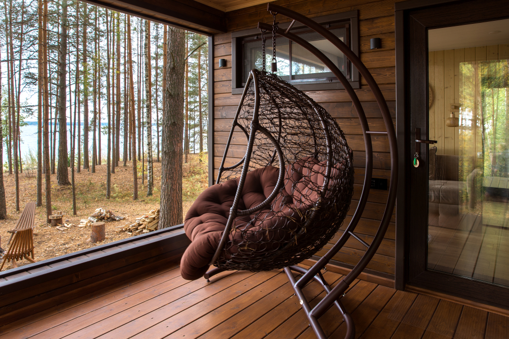 Парящая веранда над лесом с двухместным креслом-гнездом.