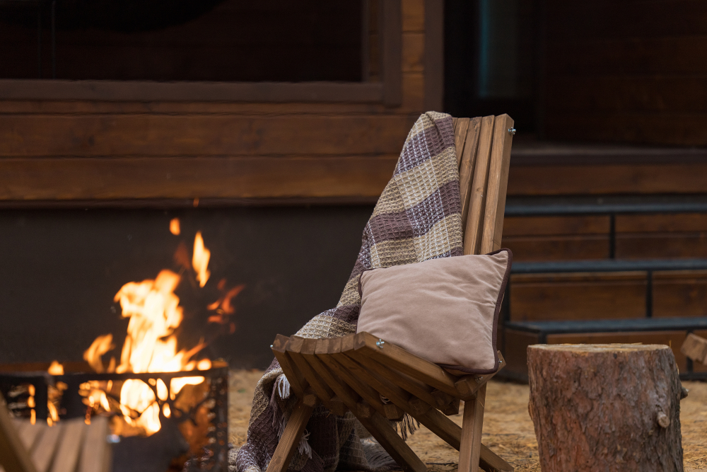 Индивидуальная атмосферная костровая зона с чашей для разведения огня, дрова, эргономичные деревянные шезлонги и мягкие пледы для самых уютных вечеров.