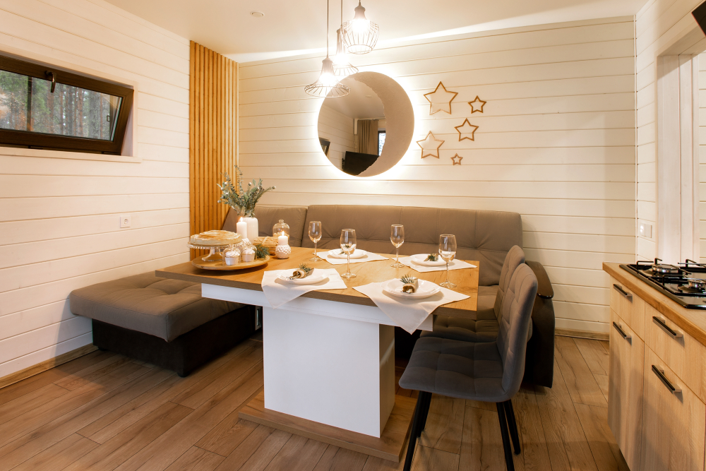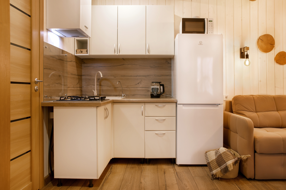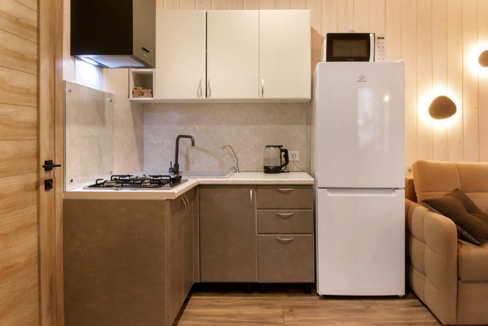 Полностью оборудованная кухня с эстетичной посудой и всей необходимой техникой.