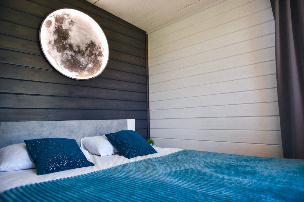 Стильный интерьер, 4 спальных места (двуспальная кровать и диван).