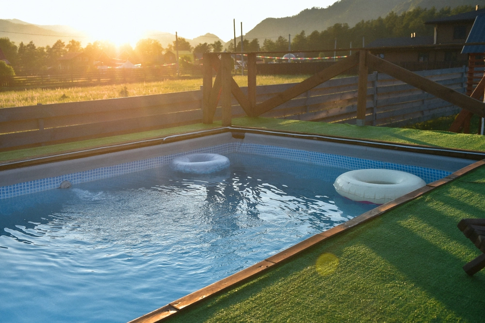Открытый бассейн: Чистая вода, надувные круги, панорамный вид на горы.