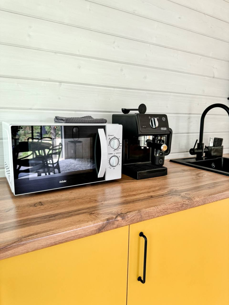 Полностью оборудованная кухня: варочная панель, холодильник, кофемашина, микроволновка, чайник.