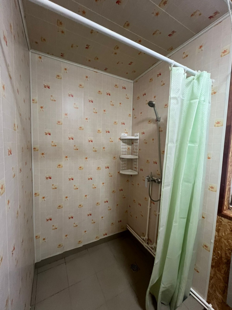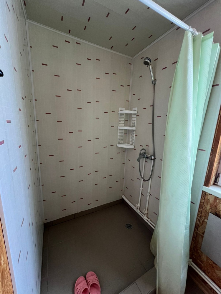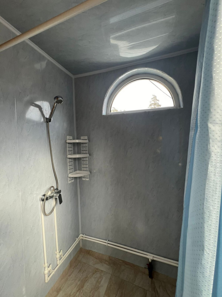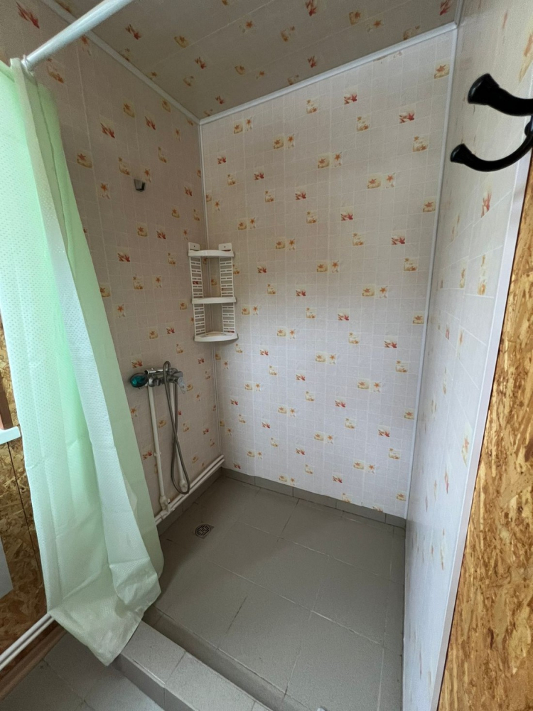 Ванная комната с душем, феном и косметическими принадлежностями.