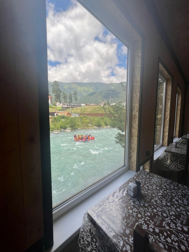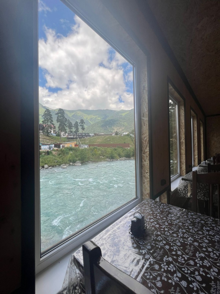 Мы находимся в центре Архыза на живописном берегу реки Большой Зеленчук