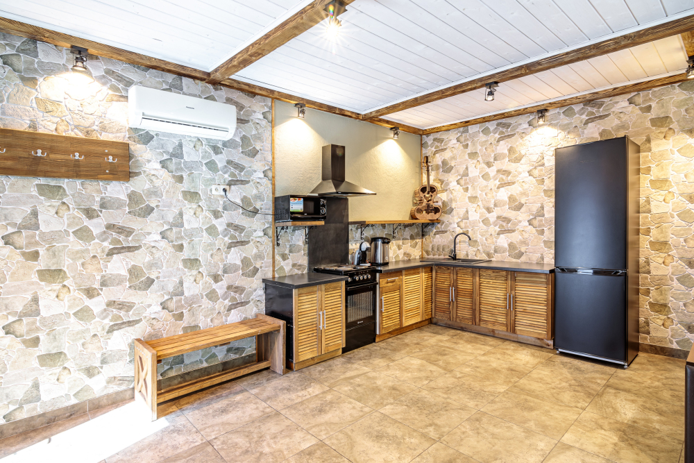 Да, есть кухня для самостоятельного приготовления пищи в домиках: