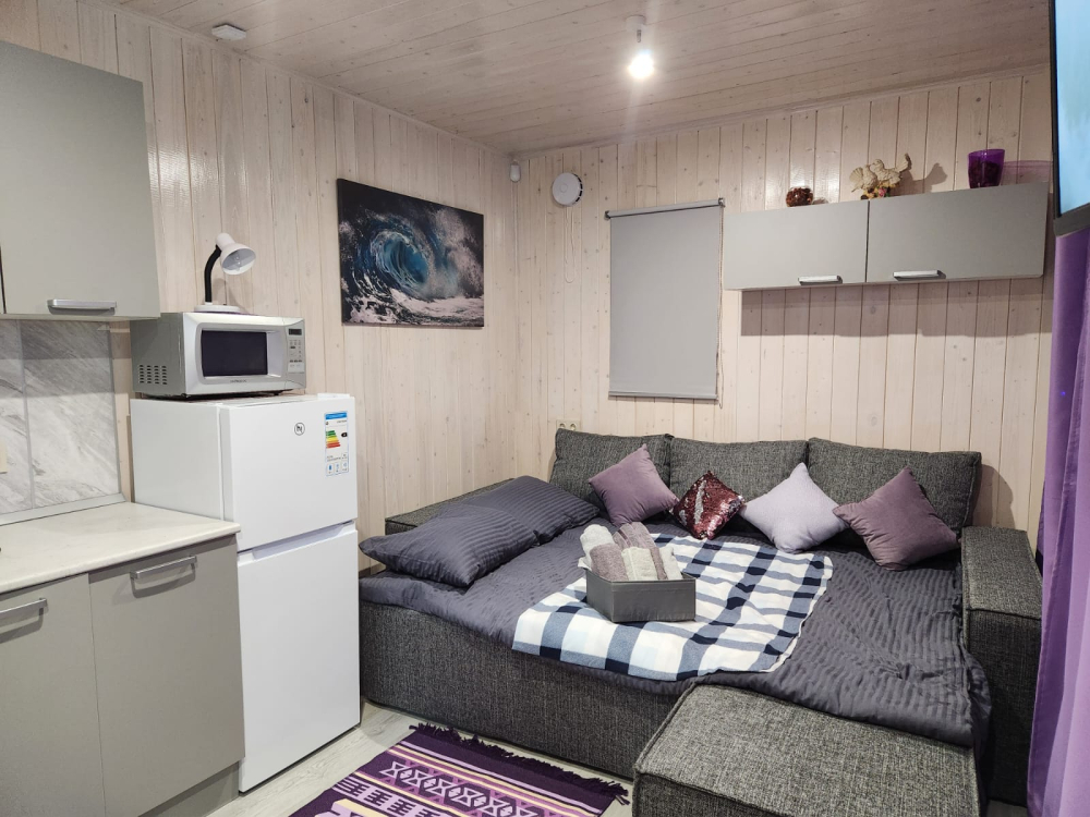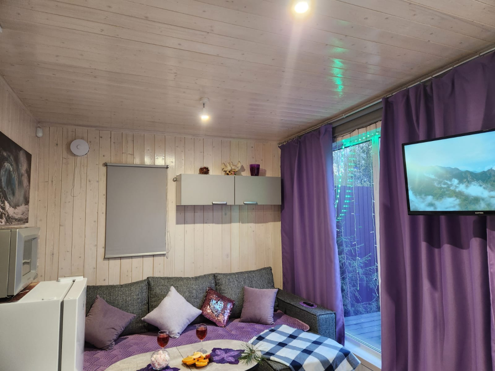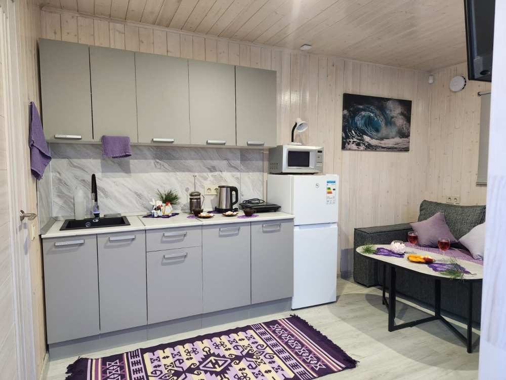 Домики уютные и теплые, с панорамными окнами, полностью оборудованной кухней (плита, микроволновка, холодильник, посуда).
