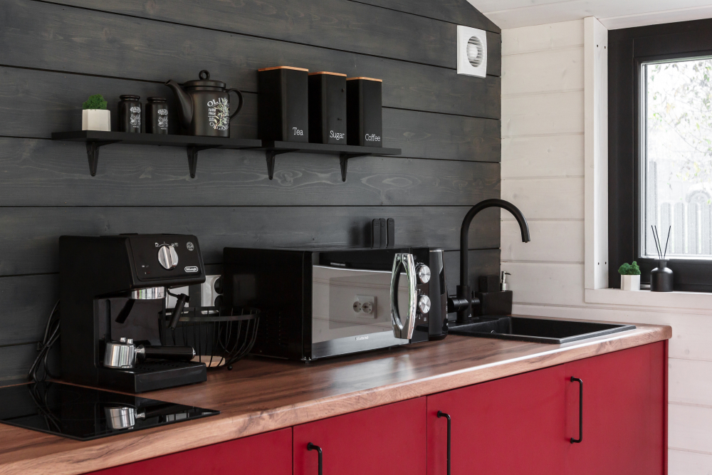 Полностью оборудованная кухня: варочная панель, холодильник, кофемашина, микроволновка, кофемолка, чайник, тостер.