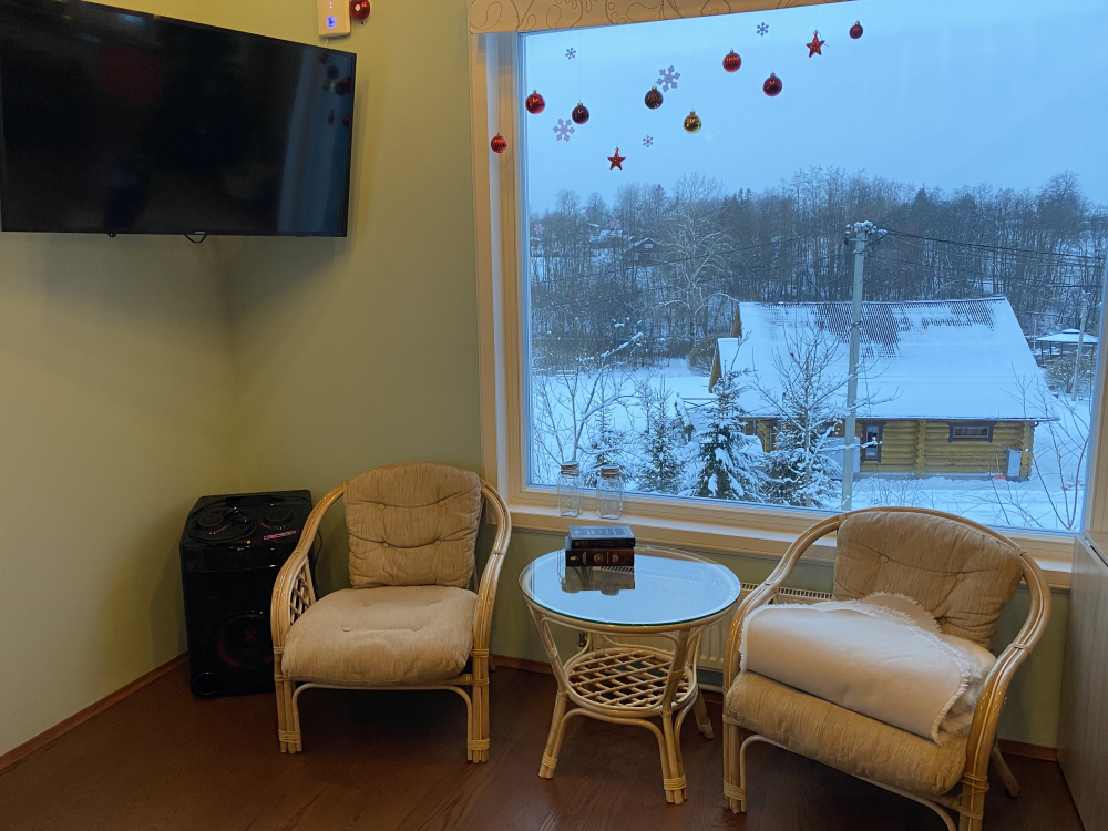 Большая гостиная для праздничных застолий: несколько столов, стулья, большой раскладной диван, набор плетёной мебели, телевизор, музыкальный центр, Wi-Fi, караоке.