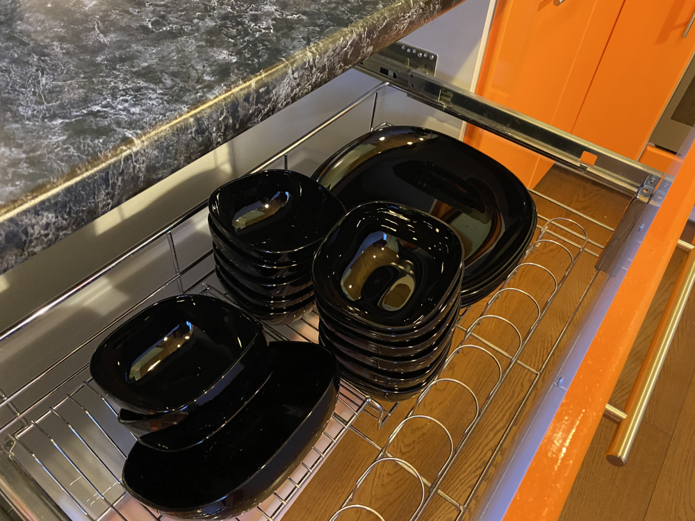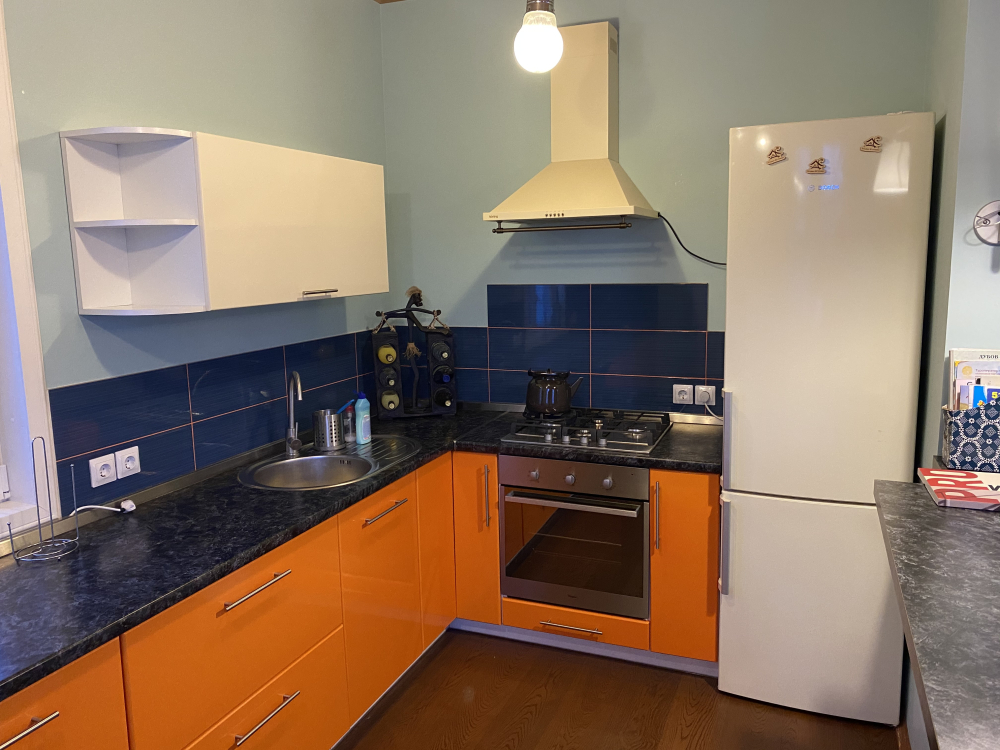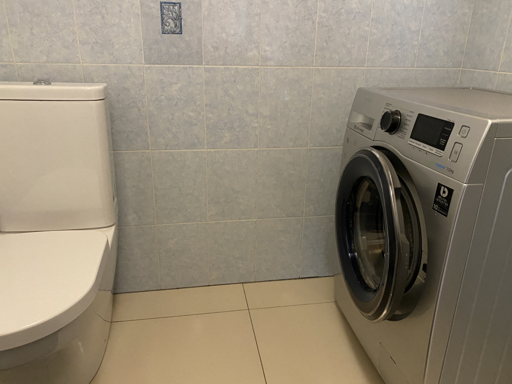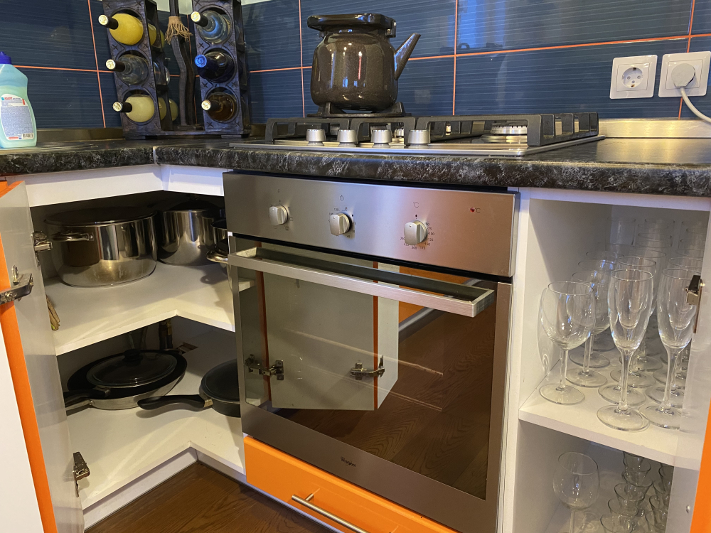 Кухонная зона с барной стойкой, полностью оборудованная (холодильник, газовая плита, СВЧ, чайник, посудомоечная машина, духовой шкаф, кастрюли, сковороды, посуда для приготовления и сервировки, детский стульчик).