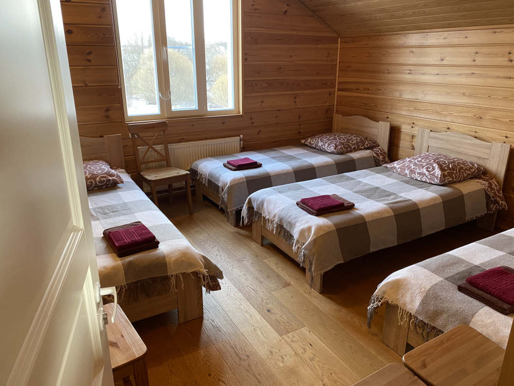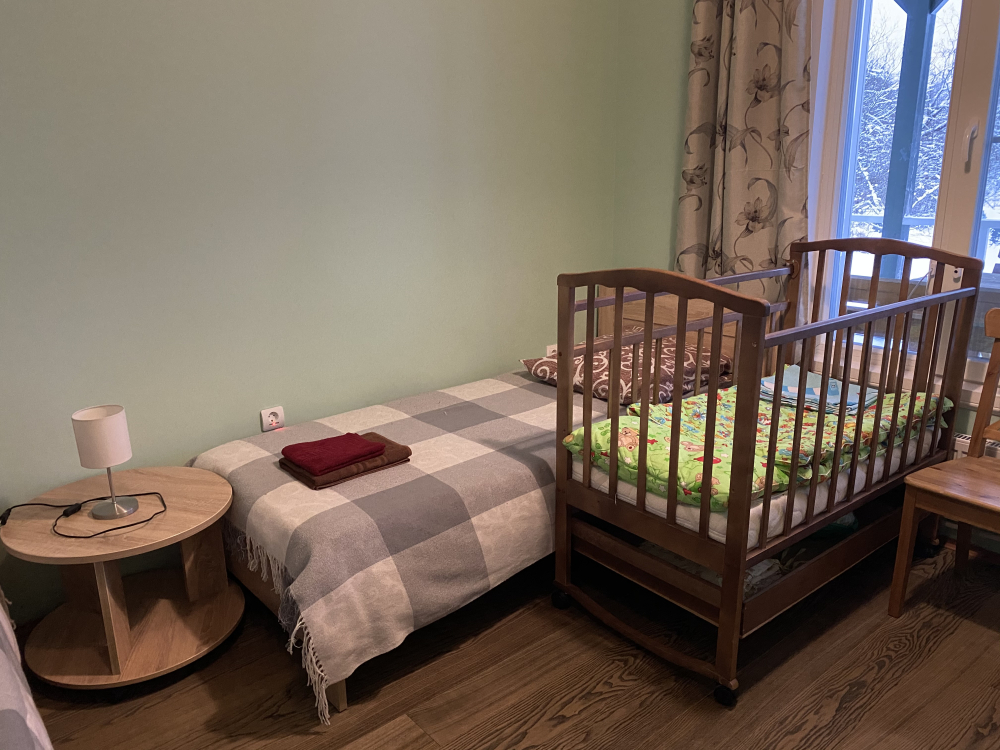 Спальная комната с 3 полутораспальными кроватями, детской кроваткой, столиком и стульями.