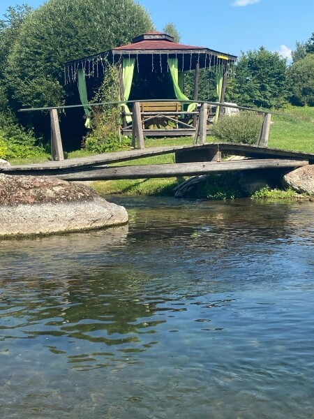 Родниковая речка: большая беседка и пляж рядом с водой.