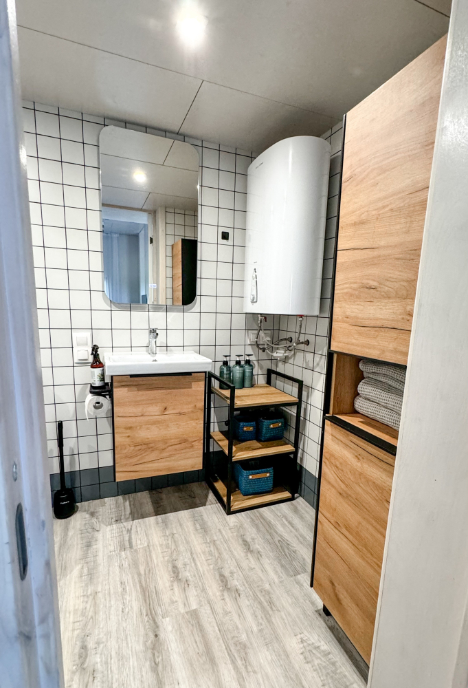 Полотенцесушитель, фен, по два полотенца для каждого гостя, жидкое мыло и гель для душа.