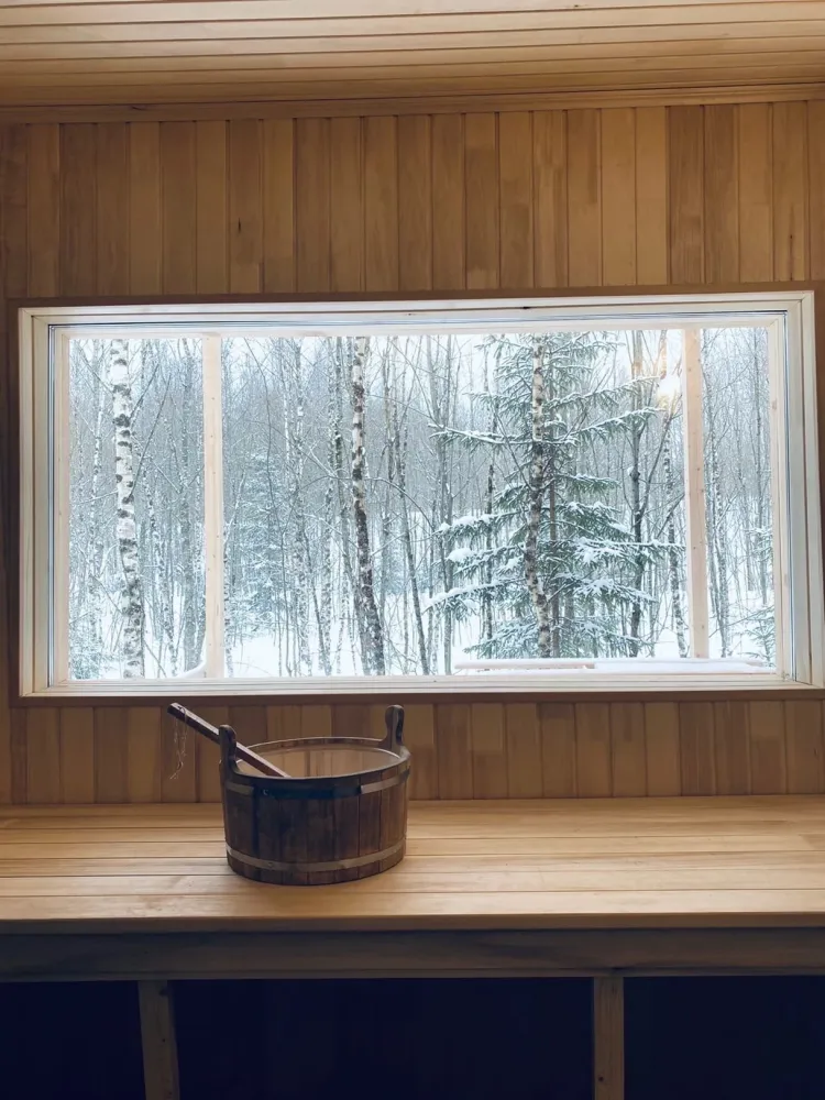 С панорамным окном в парной, большой террасой, настоящей дровяной печью, санузлом с горячей водой, туалетом и комнатой отдыха с лежанкой, террасой с удобными креслами-качалками, холодной купелью.