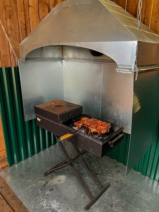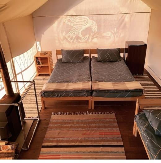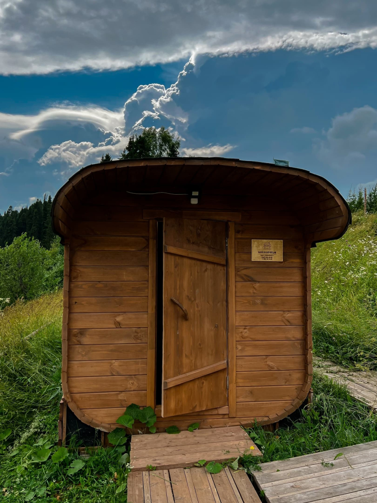 - 10 домиков с террасами. Заселение в домик - до трех человек + младенец (три комфортные кровати с ортопедическими матрасами; детская кроватка предоставляется бесплатно по договоренности). Возможность предоставления дополнительного места (раскладушка). Домики оснащены всем необходимым: холодильник, электрочайник, дровяная печь, розетки, освещение. Полы с подогревом. Зимой поддерживается температура + 22 градуса.