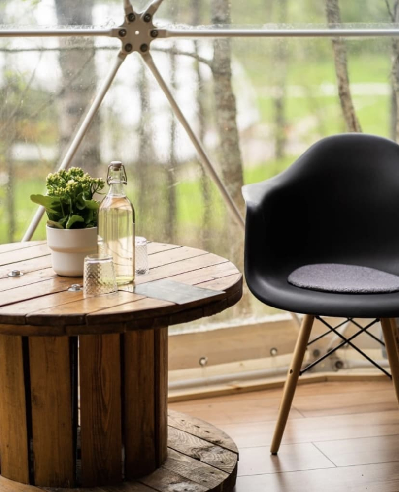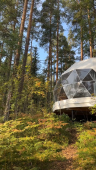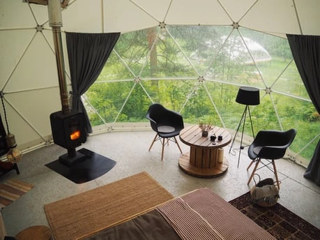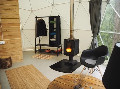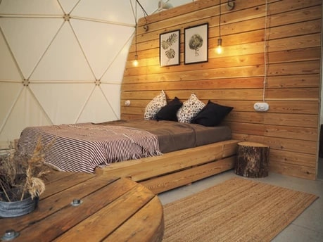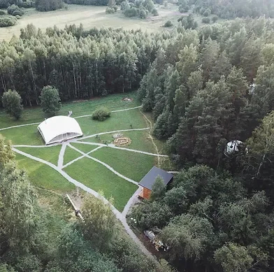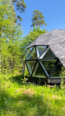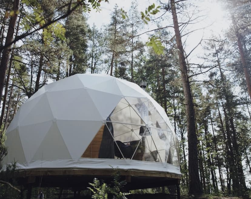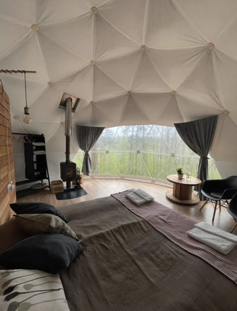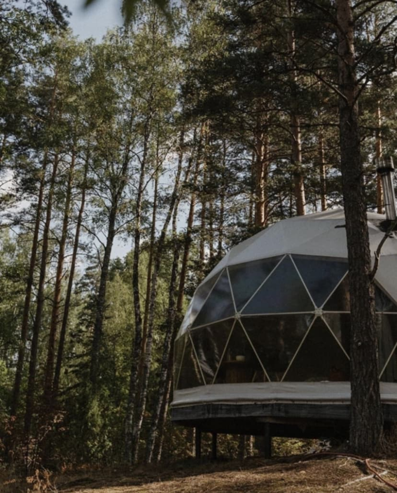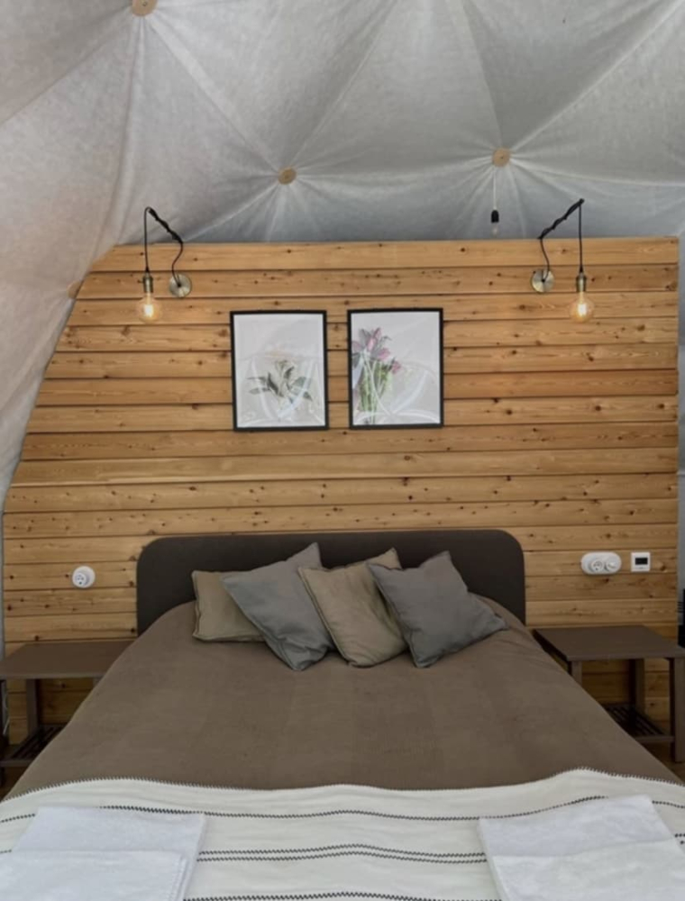 На территории располагаются шесть купольных домиков, каждый из которых сохраняет романтику палаточного отдыха с пением птиц и шумом сосен, но гарантирует комфорт высокого уровня: белоснежное постельное бельё, двуспальная кровать, биотуалет, система хранения и живописный камин, создающий уют. Для малышей мы устанавливаем детскую кроватку.
