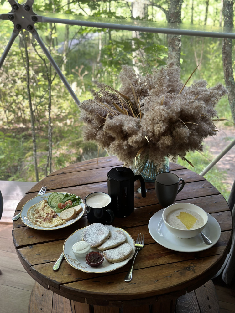 На свежем воздухе всегда хочется подкрепиться, и наш гастробар готов прийти на помощь: вкусный завтрак включён в стоимость номера, обед и ужин доступны дополнительно, предусмотрены детские стульчики для малышей, а для всех блюд есть вегетарианские варианты; питание подаётся по расписанию и предварительному заказу, а закуски можно заказать в течение дня.