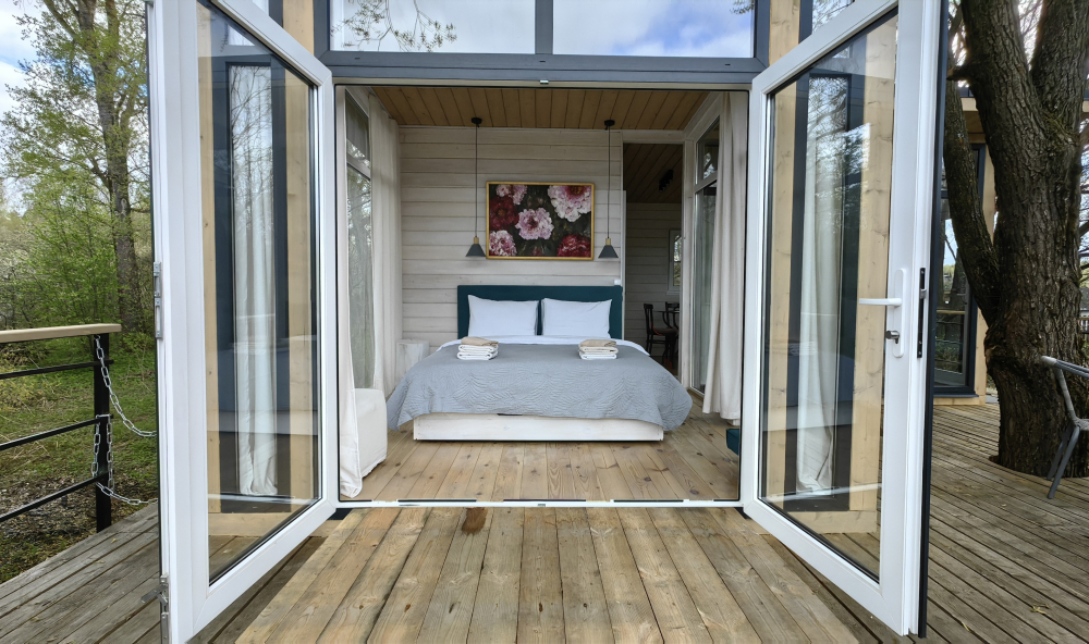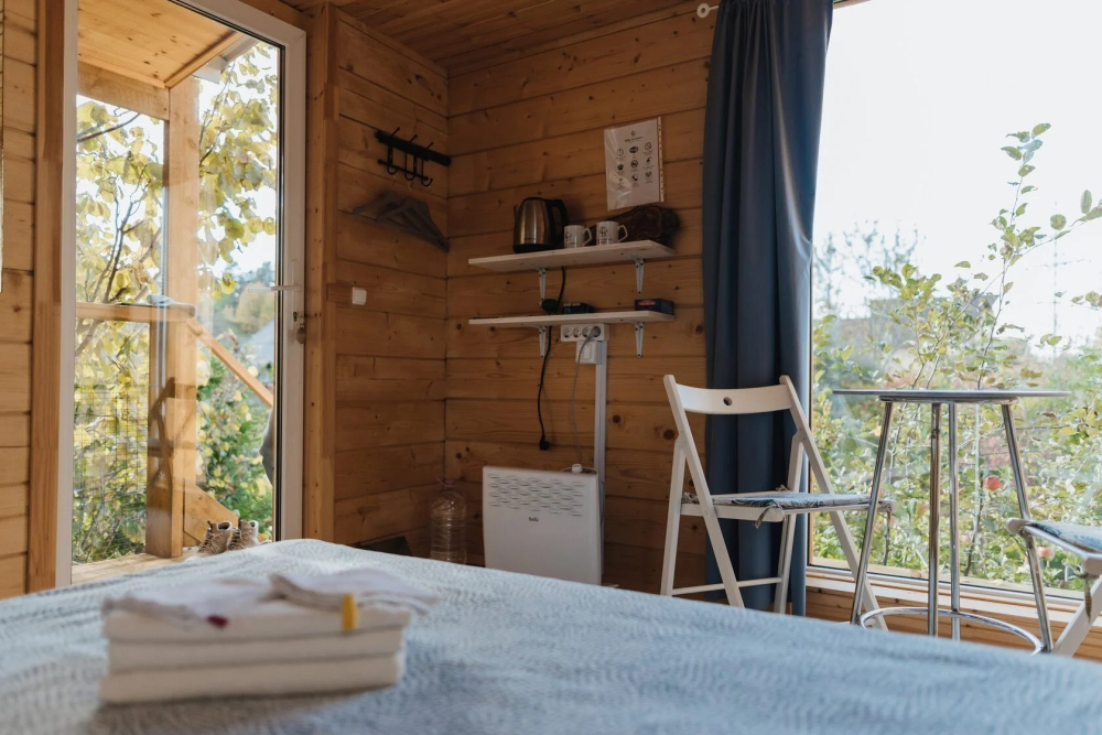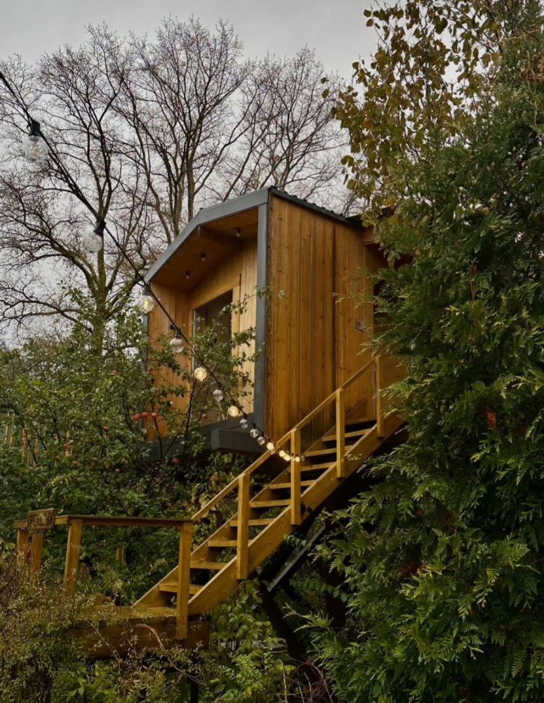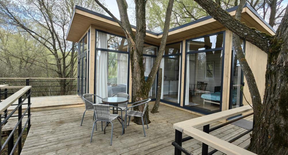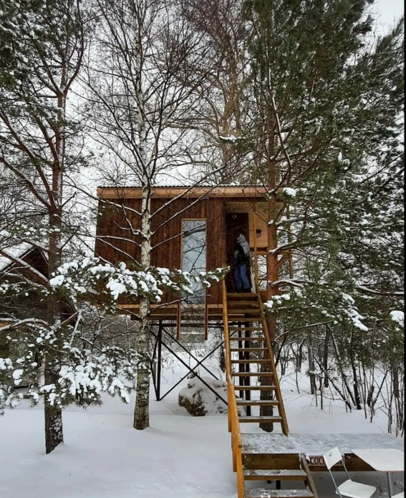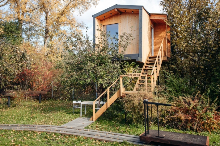 Эти уникальные дома расположены на высоте более 4 метров среди берез, сосен и лесных орехов. Каждый домик оснащен панорамными окнами с видом на сад и уютными террасами, где можно слушать шелест листвы и пение птиц.