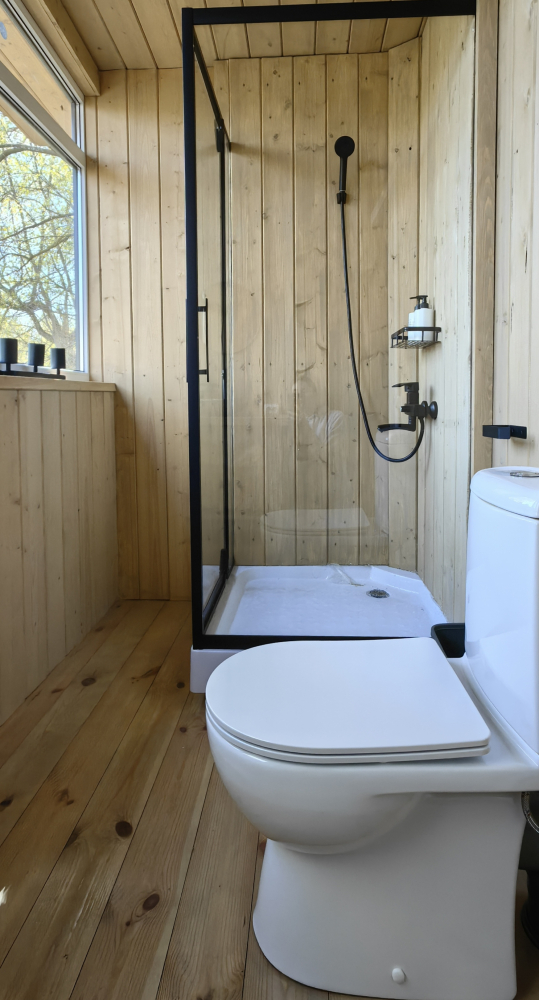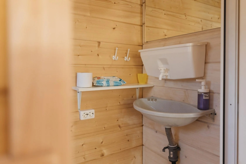 В домиках есть биотуалет и умывальник. Санузел с душем находится в общем здании (в 30-70 м от домиков). Что есть: полотенца, шампунь, жидкое мыло, фен. Что взять с собой: средства личной гигиены, зубные щетки, зубную пасту, тапочки.