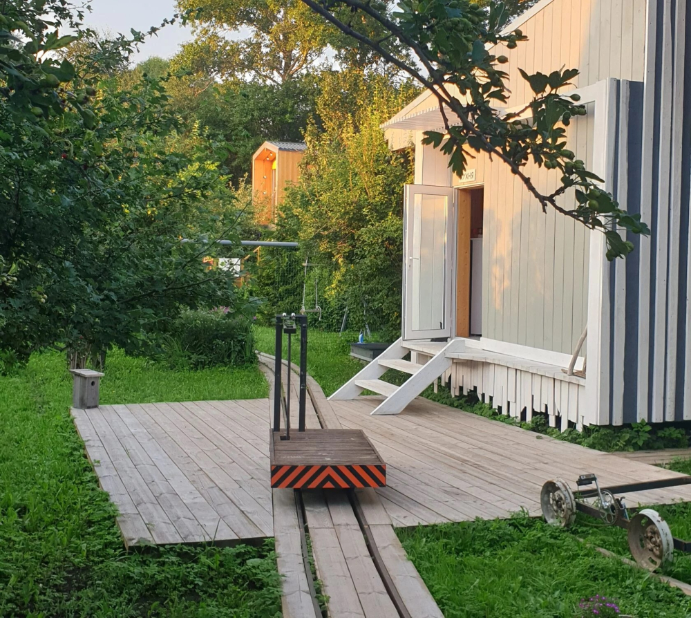 Настоящая узкоколейная железная дорога с ручной дрезиной для передвижения между домиками.