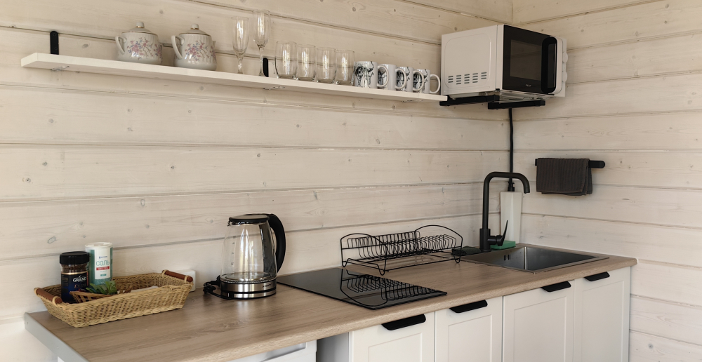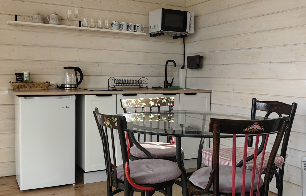 На территории нет кафе. Есть общая кухня (на 4 домика). Ближайшее кафе "Ботик" находится в 500 м. Много хороших кафе в центре Переславля - в 4 км. Ближайший супермаркет 2,5 км.