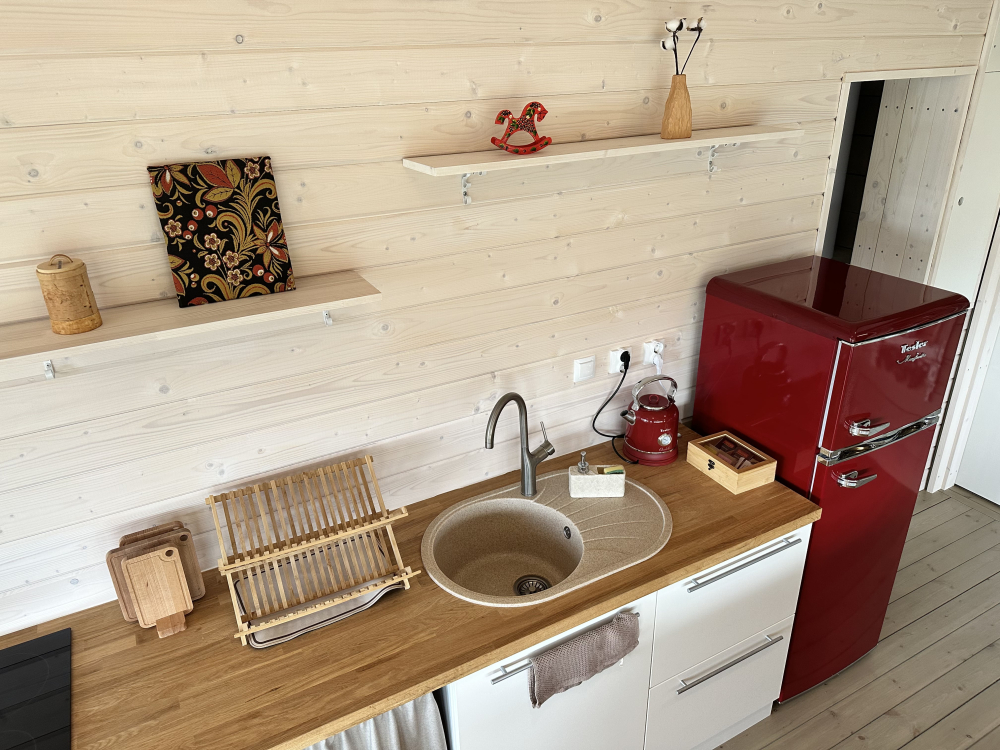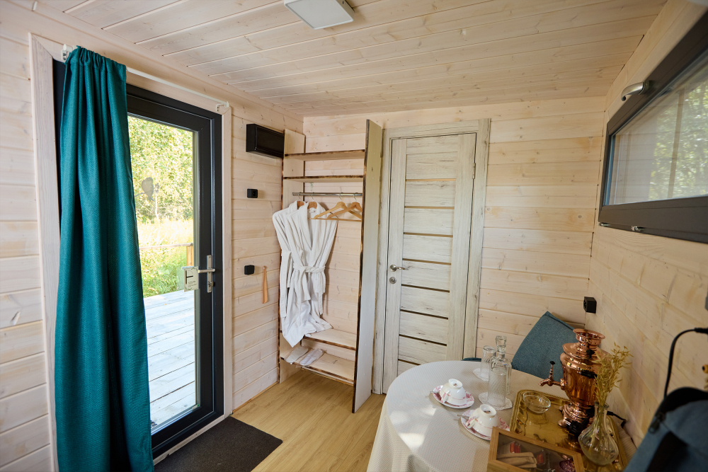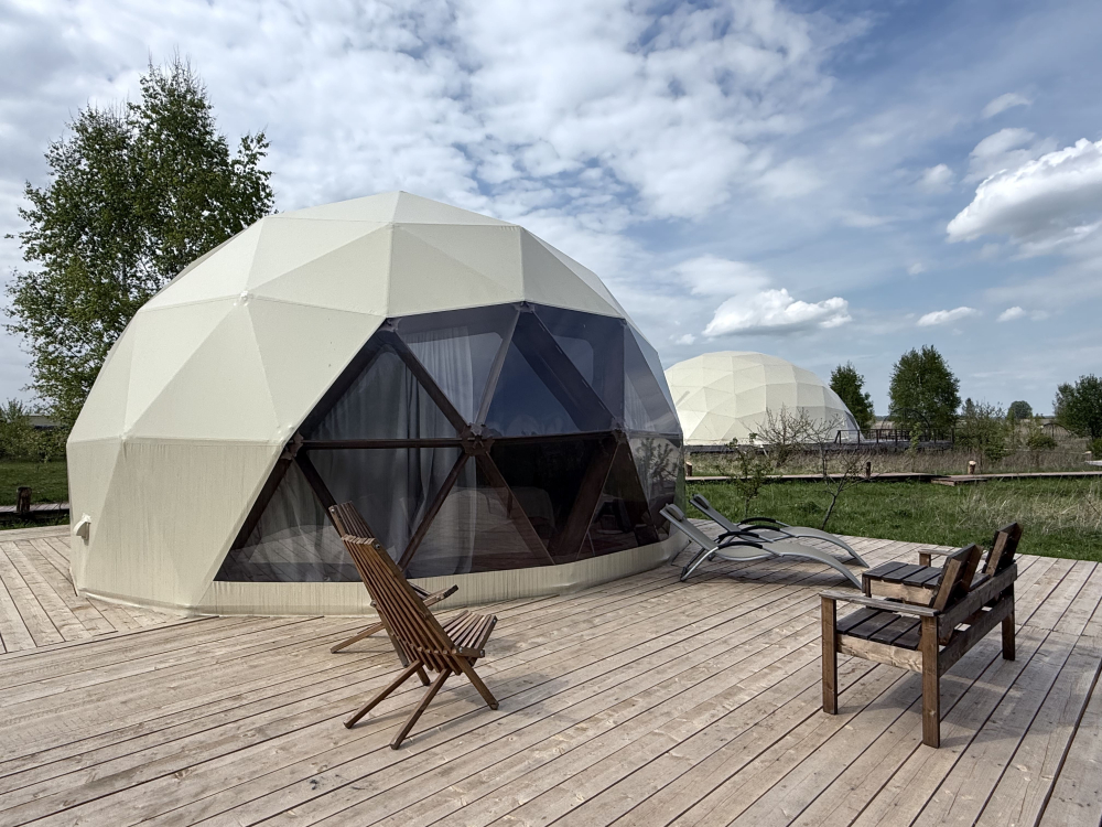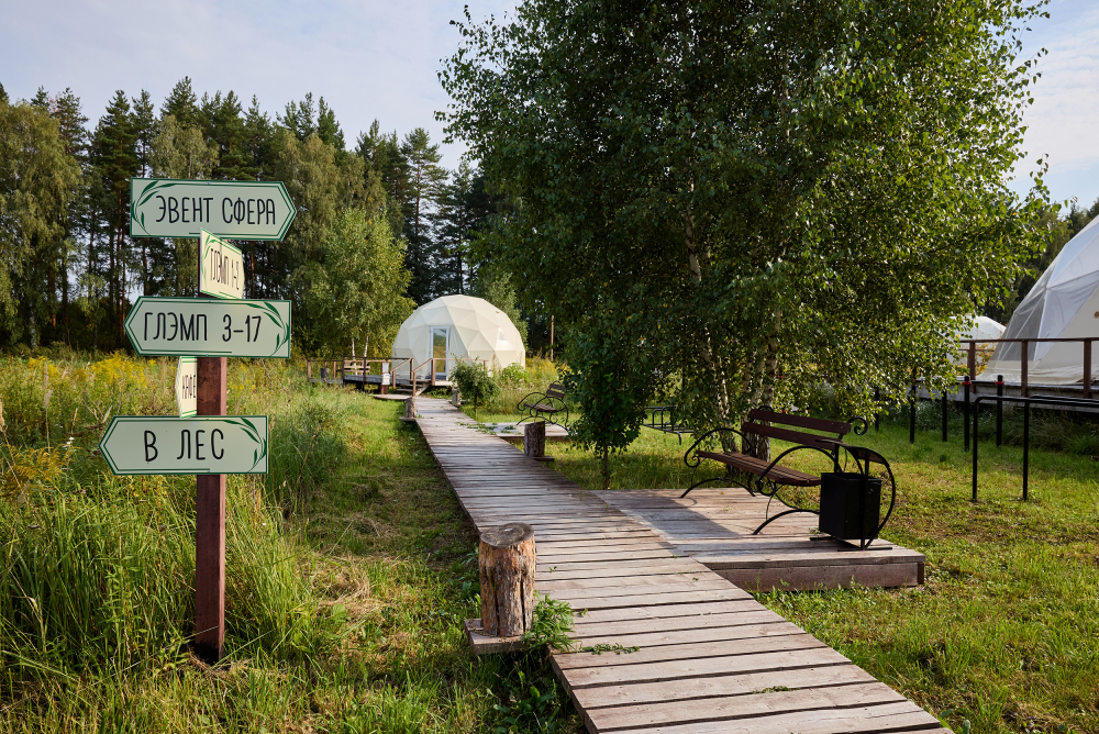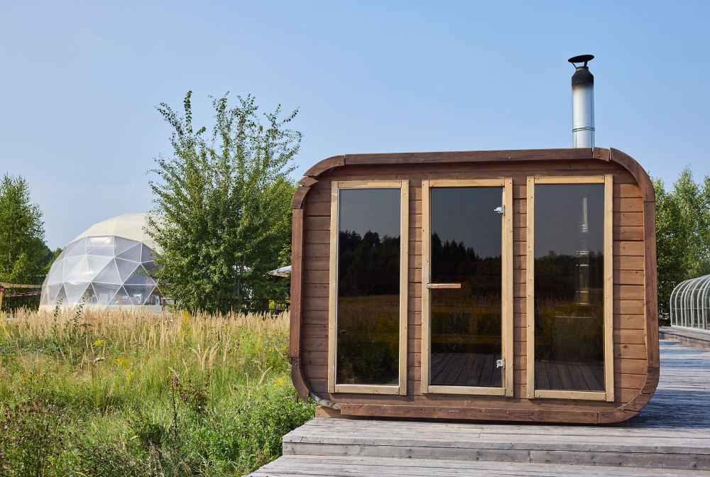 Русская баня — классическая баня с панорамными видами, дровяной печью и влажным паром. По желанию доступна холодная купель. Время посещения — 2 часа, вместимость до 4 гостей (1 сфера/домик).