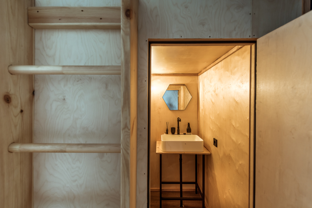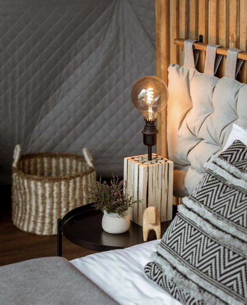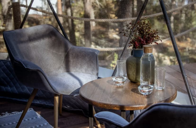 Внутри: две удобные нижние кровати или одна большая для пар, дополнительное спальное место наверху, прикроватный столик, два кресла и журнальный стол у панорамного окна с видом на лес и озеро.