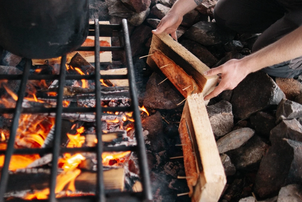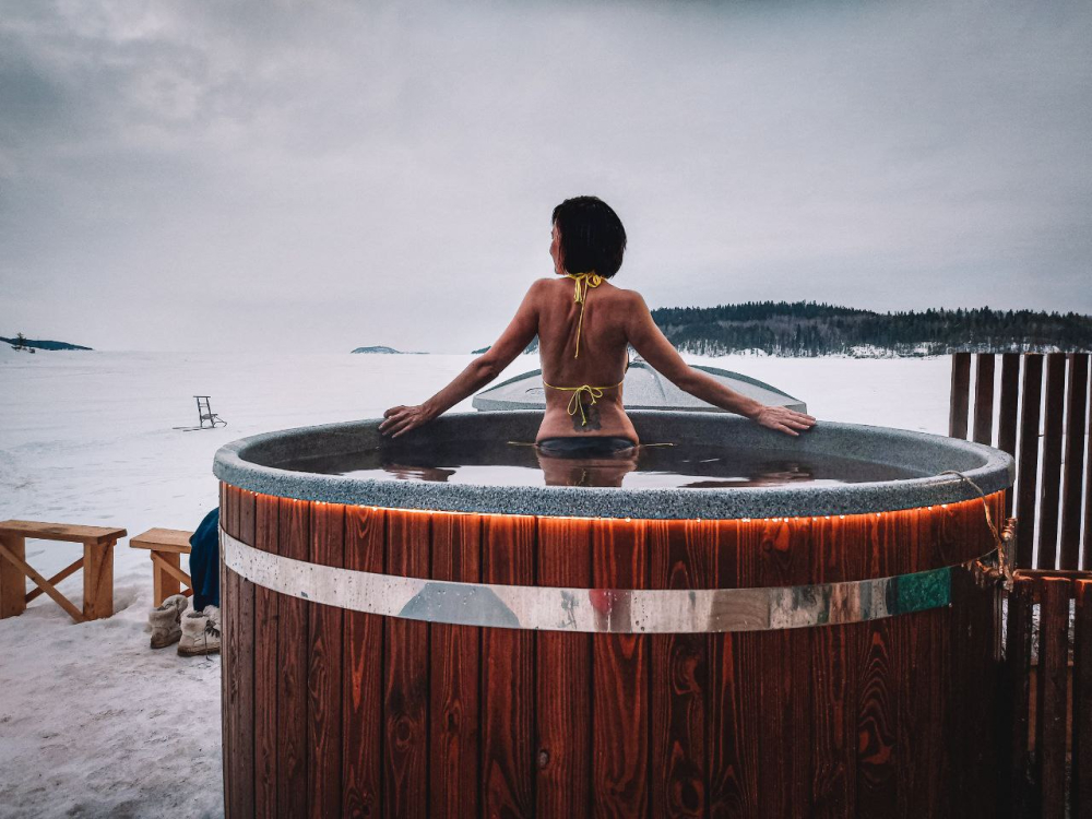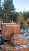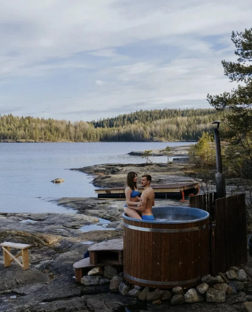 Две открытые купели на берегу озера с печкой для подогрева воды.