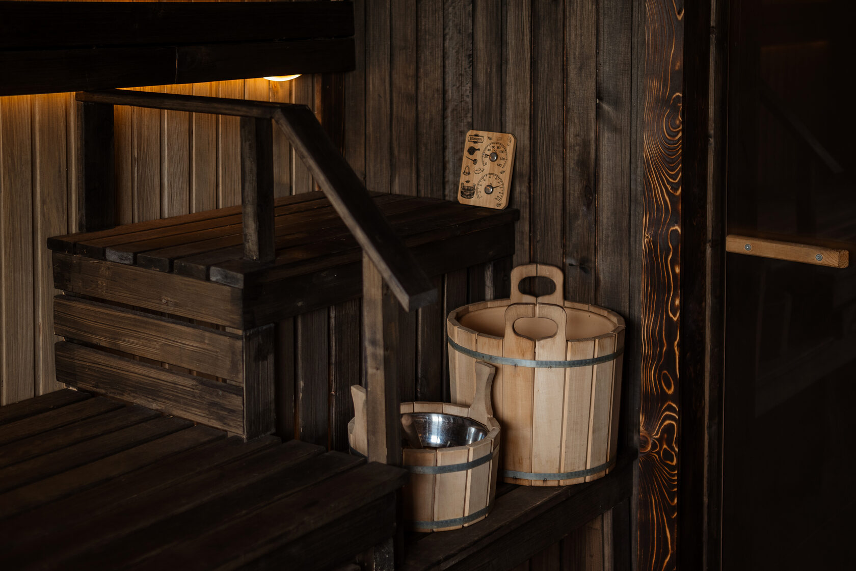 Просторная парилка, комната отдыха с панорамными окнами на озеро, три отдельные душевые кабинки, биотуалет.