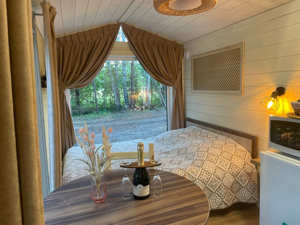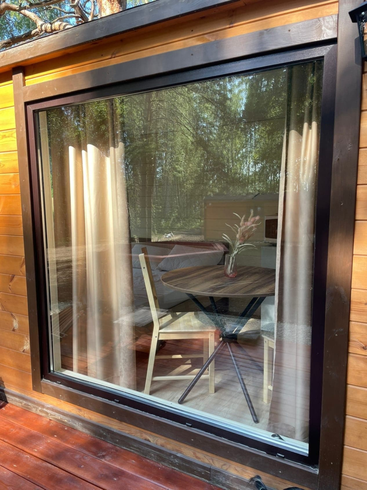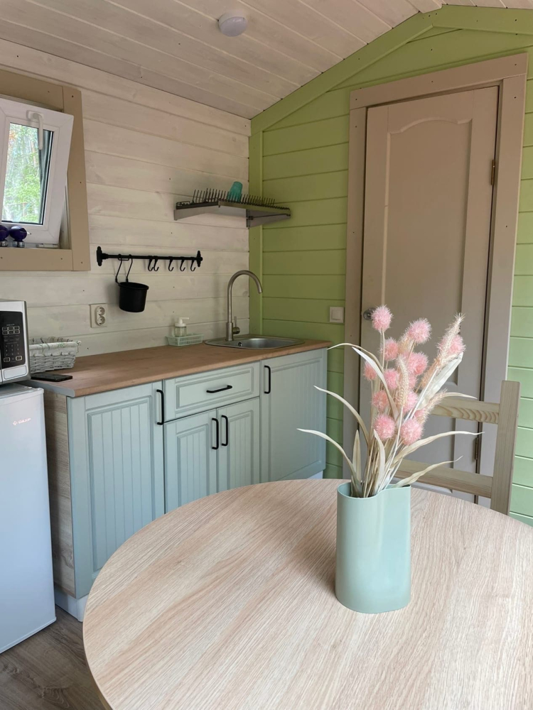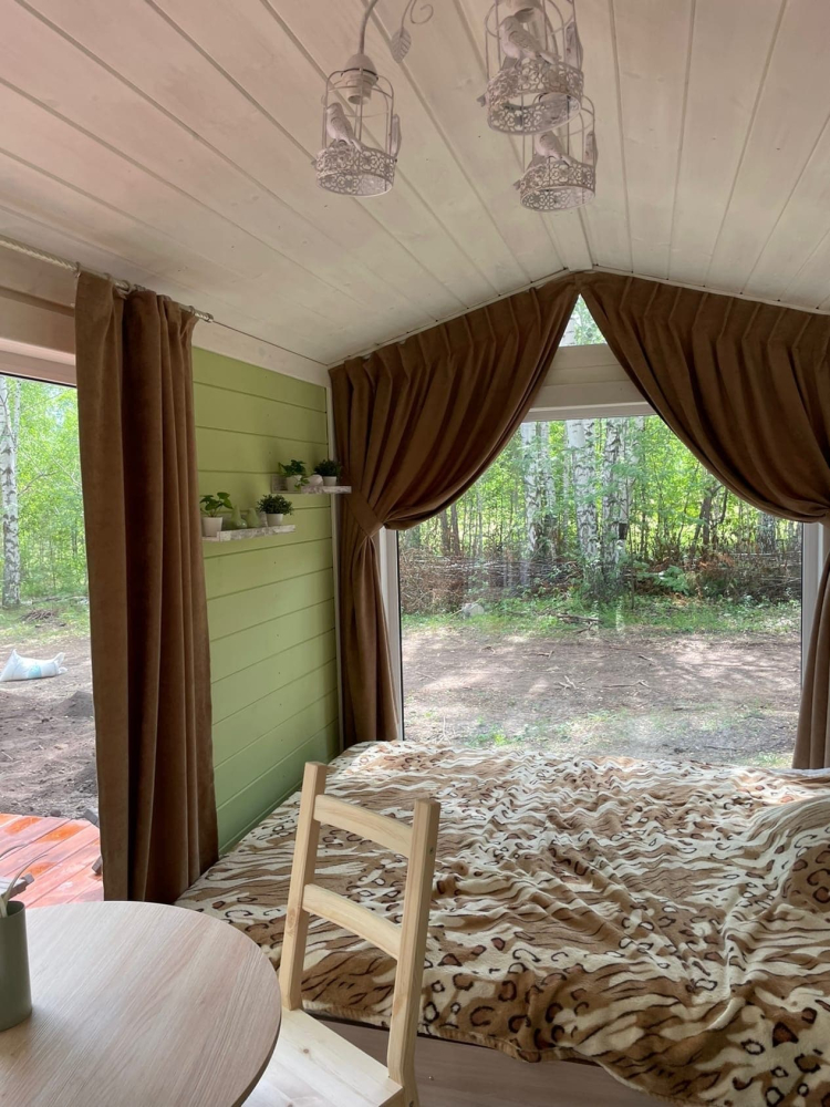 Светлый двухместный домик с панорамными окнами выполнен в светлых оливковых тоннах, с акцентом французского кантри. Стиль домика, навевающий воспоминания о деревне, сельской природе. Наполнен текстилем, зеленью, кактусами и другими аксессуарами.
