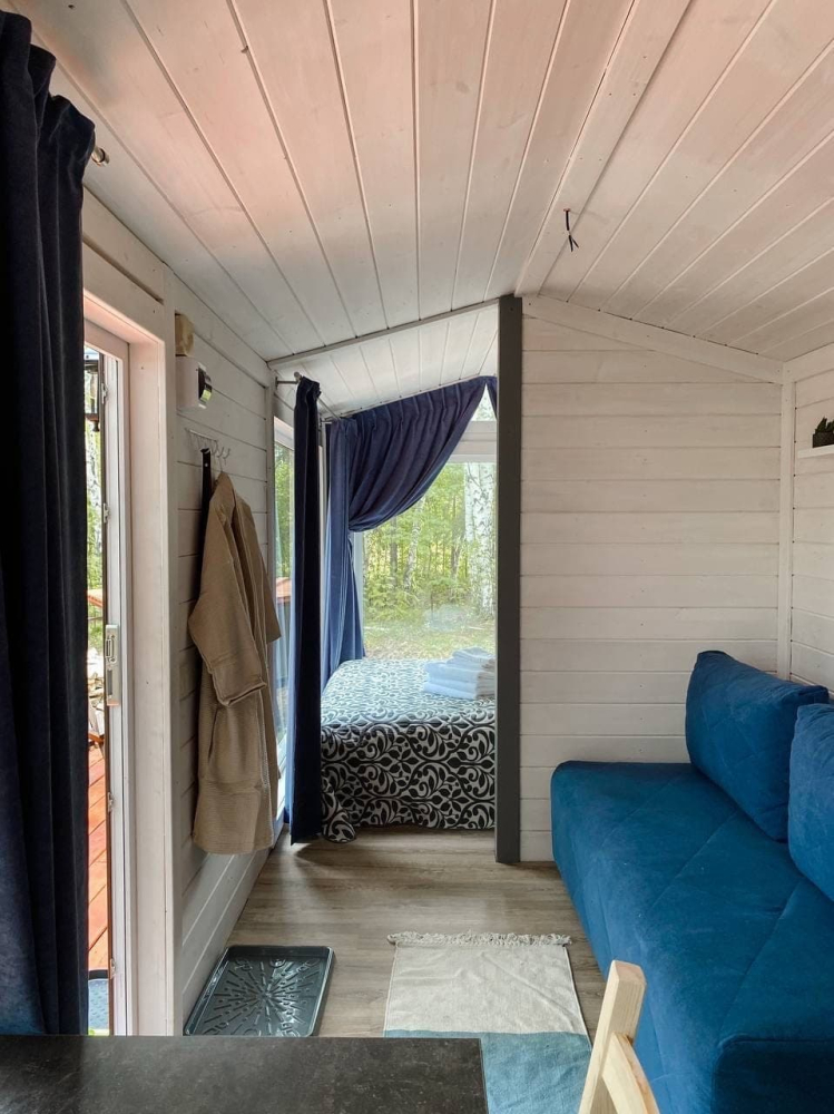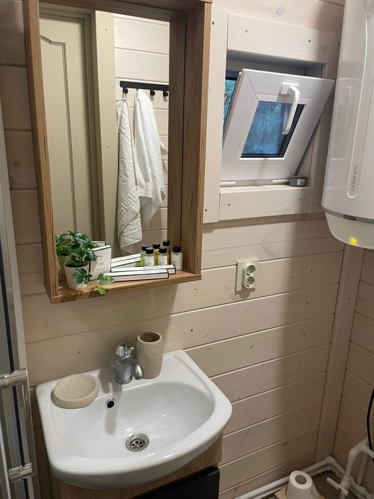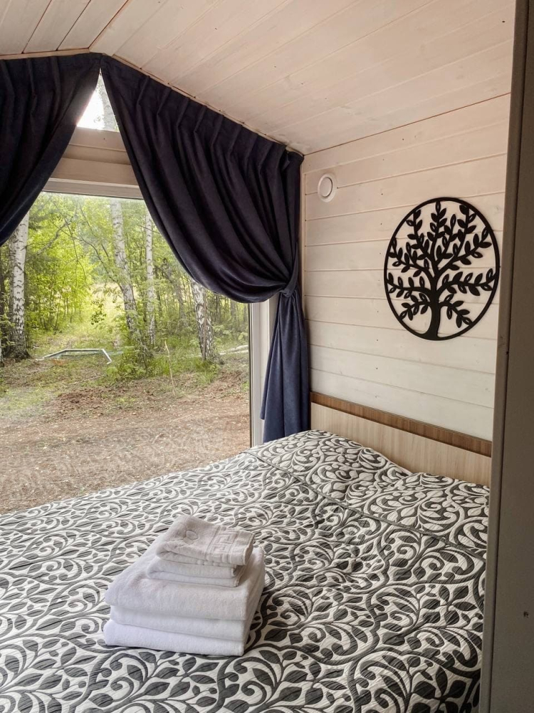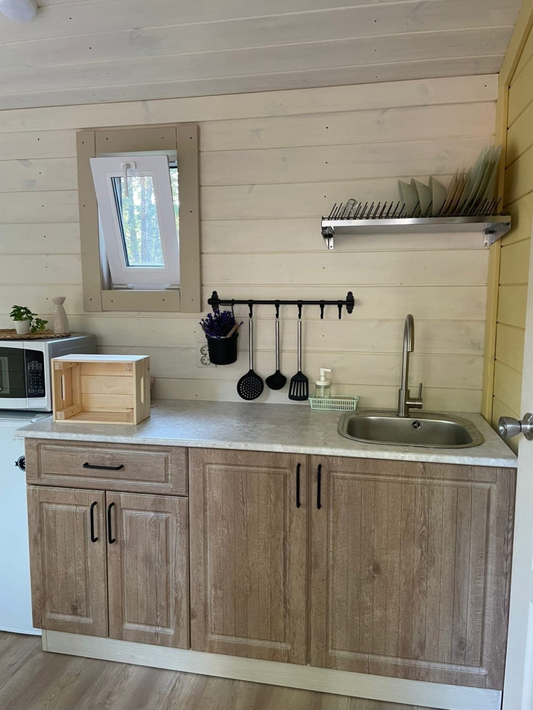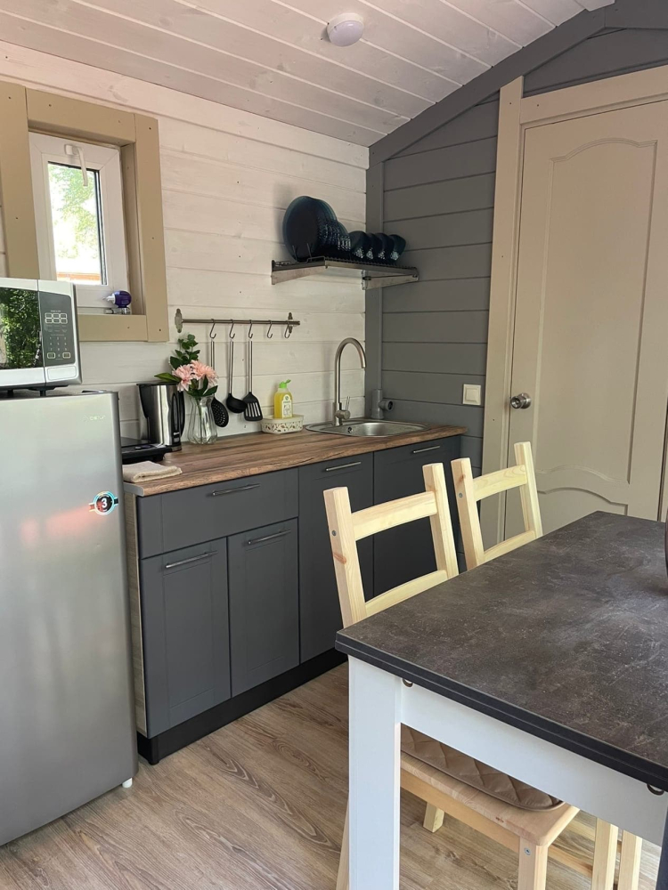 Светлый двухместный домик с панорамными окнами выполнен в светлых оливковых тоннах, с акцентом французского кантри. Стиль домика, навевающий воспоминания о деревне, сельской природе. Наполнен текстилем, зеленью, кактусами и другими аксессуарами.