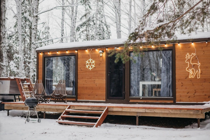 Семейный домик с панорамными окнами, террасой, банным чаном и видом на пруд. Более классический стиль в сдержанных тонах.