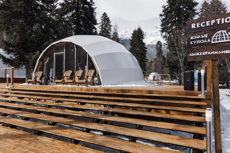 Расположен в поселке Архыз, в 7 км от горнолыжного комплекса. На территории пихтовый лес, живописные поляны, река, пробегающая по всей территории, ресепшн, лыжехранилище, детская комната, костровая зона и 8 жилых домов - куполов. В куполе есть все необходимое для комфортного проживания, у каждого купола есть своя терраса со столиком и креслами, где можно наслаждаться лесом и свежим воздухом. В куполах повышенной комфортности на террасе обустроена горячая купель - фурако,