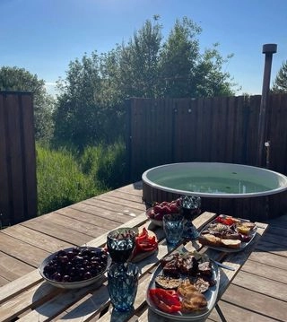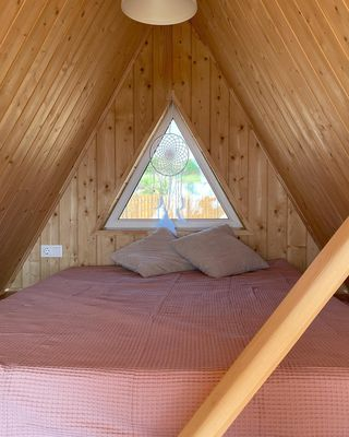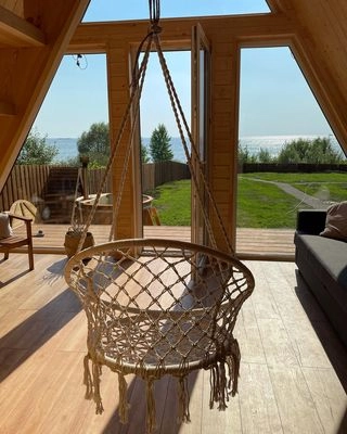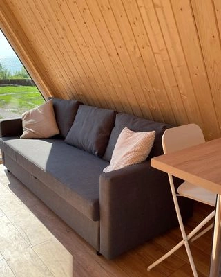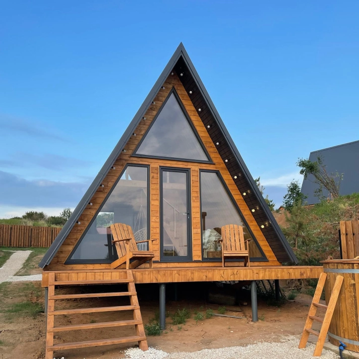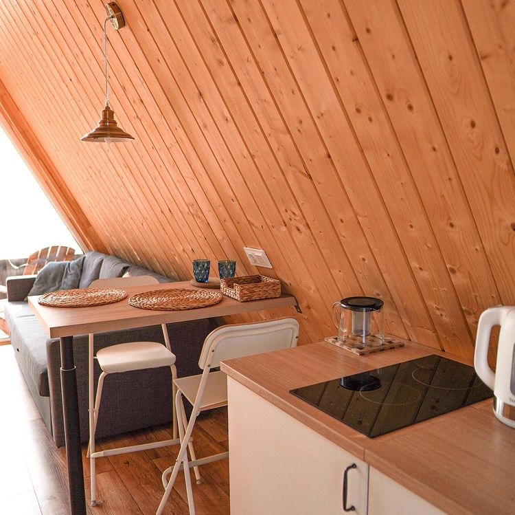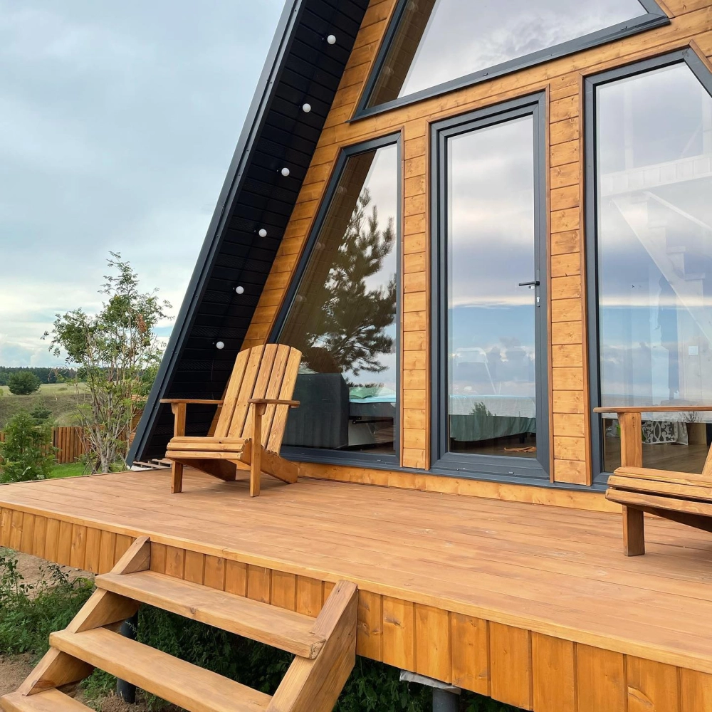Домики A-Frame вмещают до 4 человек. Внутри есть спальня с двухместной кроватью, гостиная с диваном, полностью оборудованной кухней и обеденной зоной, ванная комната, кондиционер. У домиков есть индивидуальные мангальные площадки с дровами и фурако (входит в стоимость проживания).